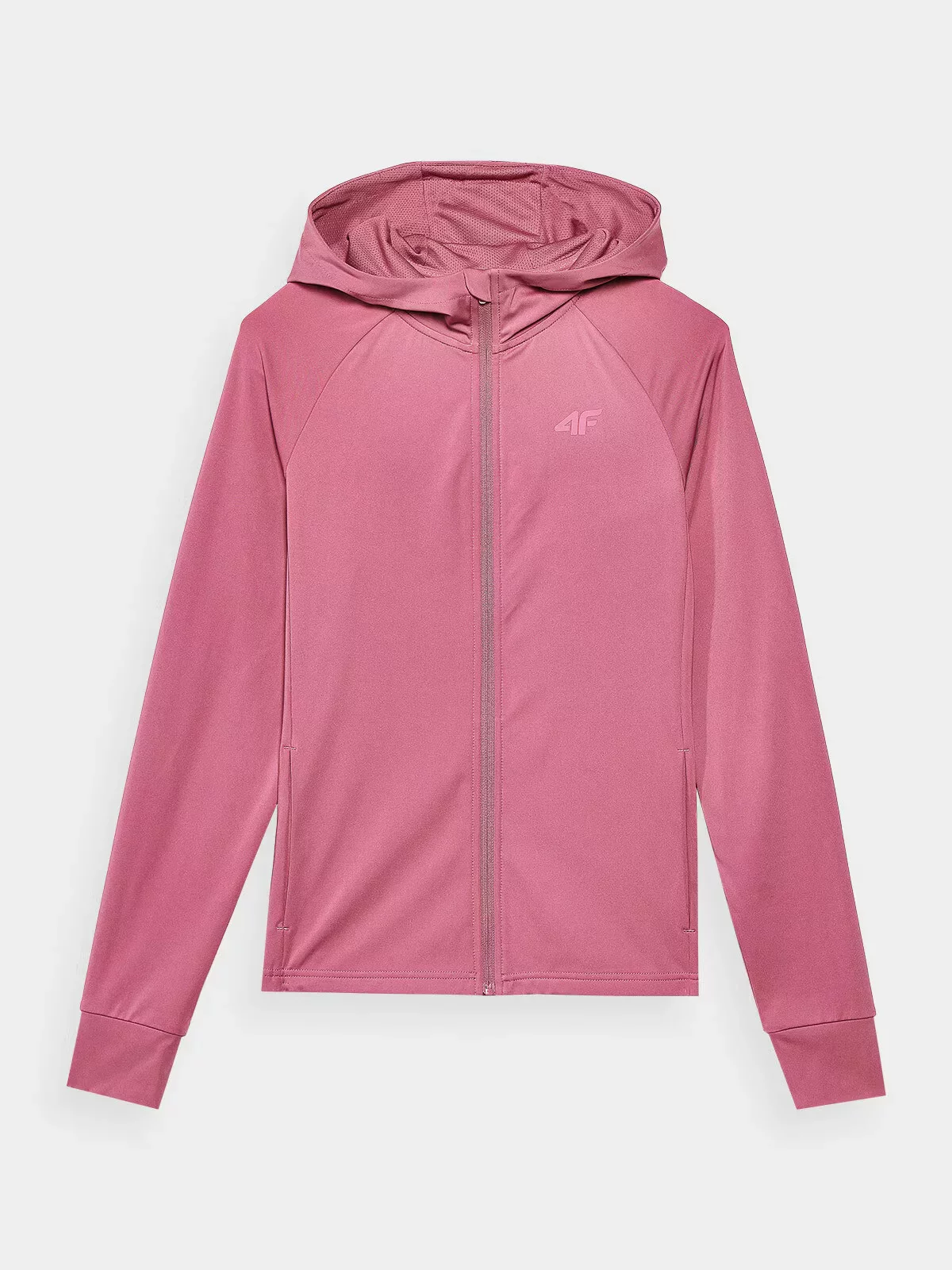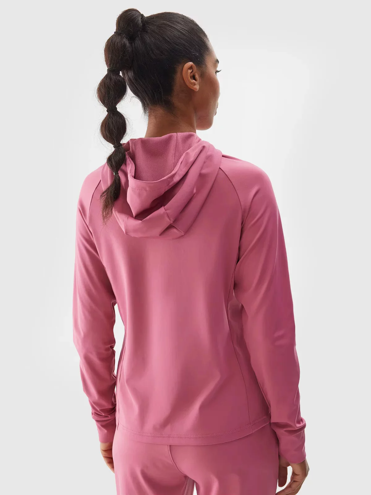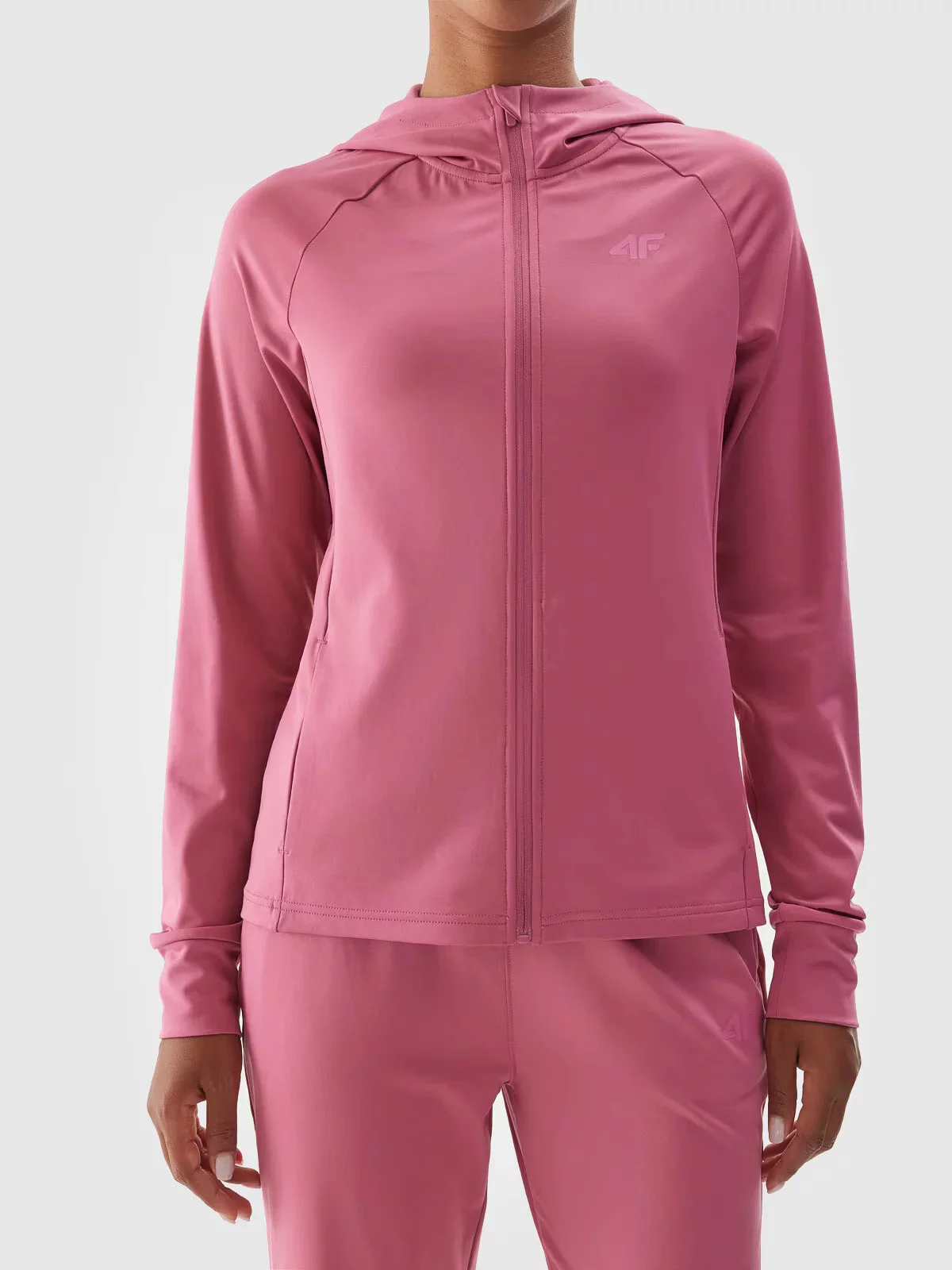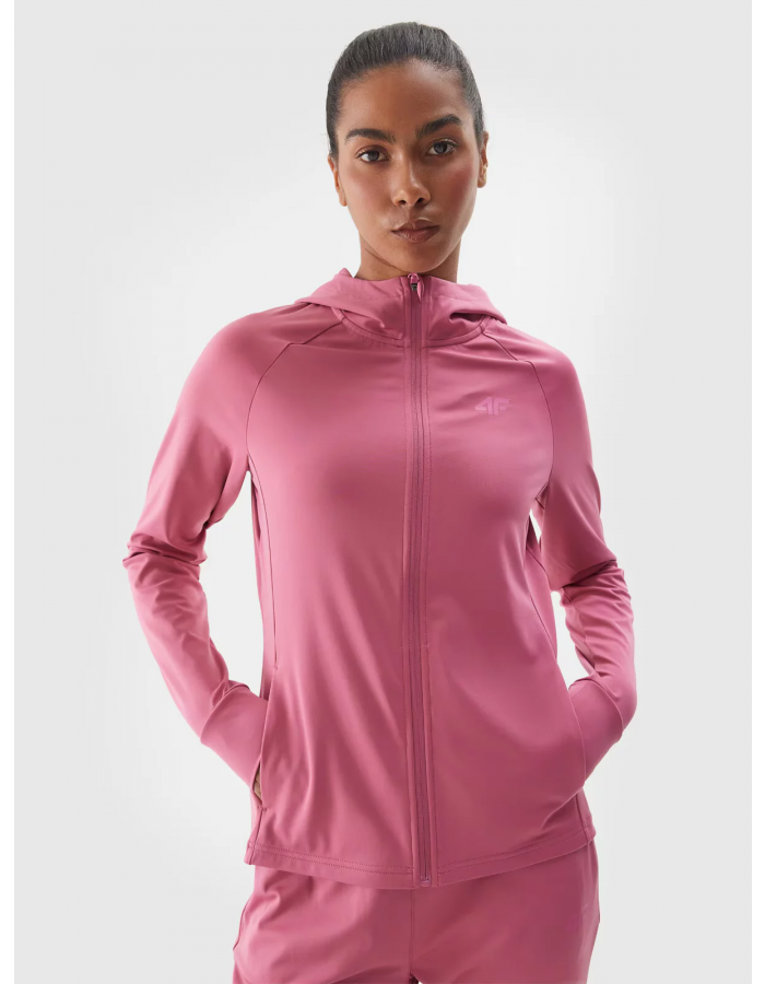 Hlavním cílem oblečení ze sportovní řady je poskytnout pohodlí a podporu při jakémkoli typu tréninku různé úrovně a intenzity. Díky pohodlnému střihu, rychleschnoucím, elastickým materiálům nebo lehkým konstrukcím poskytuje sportovní oblečení plnou volnost pohybu a umožňuje maximální soustředění a pohodlí během cvičení. Má přizpůsobený střih slim, který přiléhá k tělu. Vazba single jersey s hladkým povrchem na jedné straně je elastická a pohodlná při nošení. Dámská sportovní mikina s kapucí 4F do posilovny má střední gramáž 250 gsm, díky čemuž je měkká a prodyšnější.