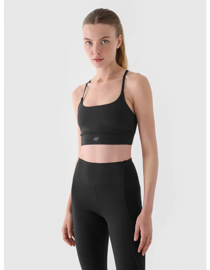 Sportovní podprsenka je vybavená rychleschnoucím vlákny s technologií 4FDry, která podporují odvádění vlhkosti daleko od těla. Výstřih do V. Model s měkkými, odnímatelnými košíčky. Guma pod poprsím bez nastavení zajišťuje podporu a přizpůsobení. Tenká ramínka s nastavením délky.
