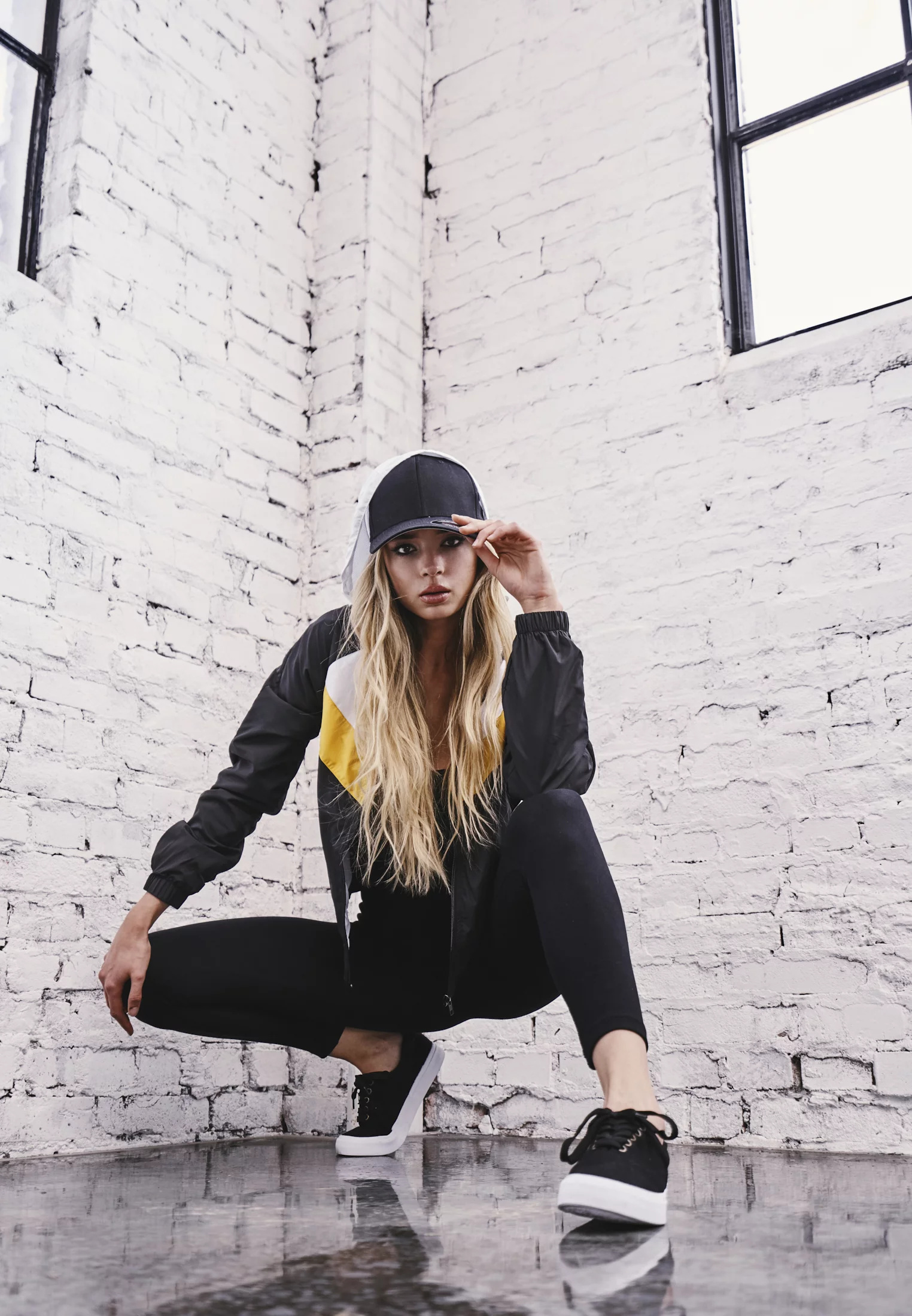 Dámská tříbarevná větrovka je lehká a sportovní, se symetrickým vzorem a kapucí, které dodávají chladné barevné kontrasty. Klasické raglánové rukávy, síťovaná podšívka a elastická šňůrka u mikiny s kapucí a pasu dodávají funkční styl.