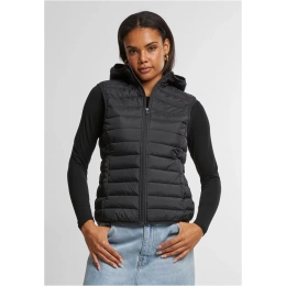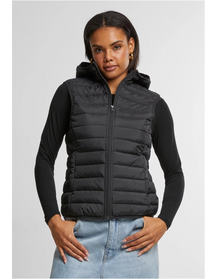 Tato vesta je černé barvy, zateplená a prošívaná, vyrobena z lehkého, ale teplého materiálu. Má kapuci a zapínání na zip po celé délce, což poskytuje dobrou ochranu před větrem a chladnějším počasím. Prošívání je vodorovné a rovnoměrně rozdělené, což přispívá k modernímu a čistému vzhledu. Vesta je ideální pro vrstvení přes trička nebo mikiny během chladnějších dnů, kdy je potřeba větší volnost pohybu.