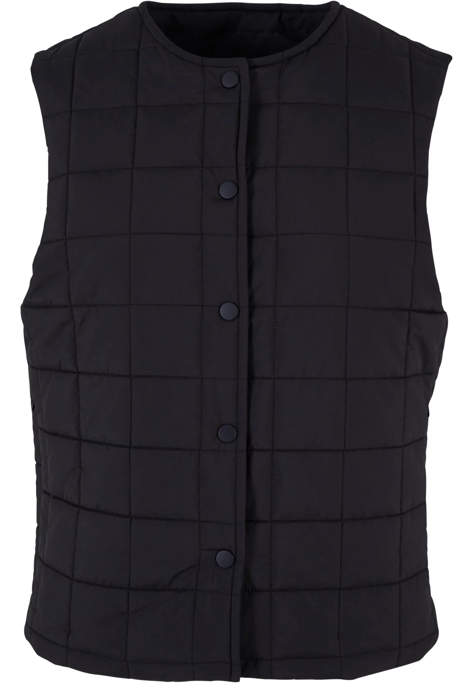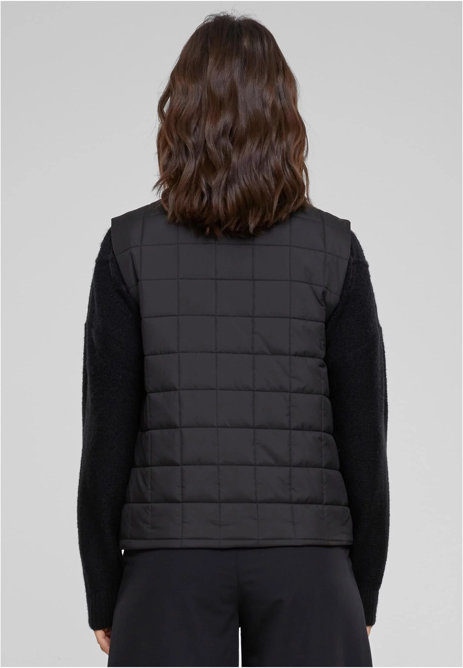 Dámská vesta má obdélníkový design přikrývky s mírně vycpanými čtverci, které také nabízejí stabilitu. Zvolený volný střih dokonale ladí s designem. Vesta se snadno obléká pomocí léga na knoflíky a je vybavena výstřihem. Vnější materiál je robustní Terylen, vnitřek je podšitý jemným taftem.