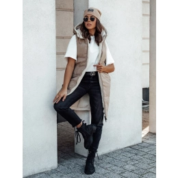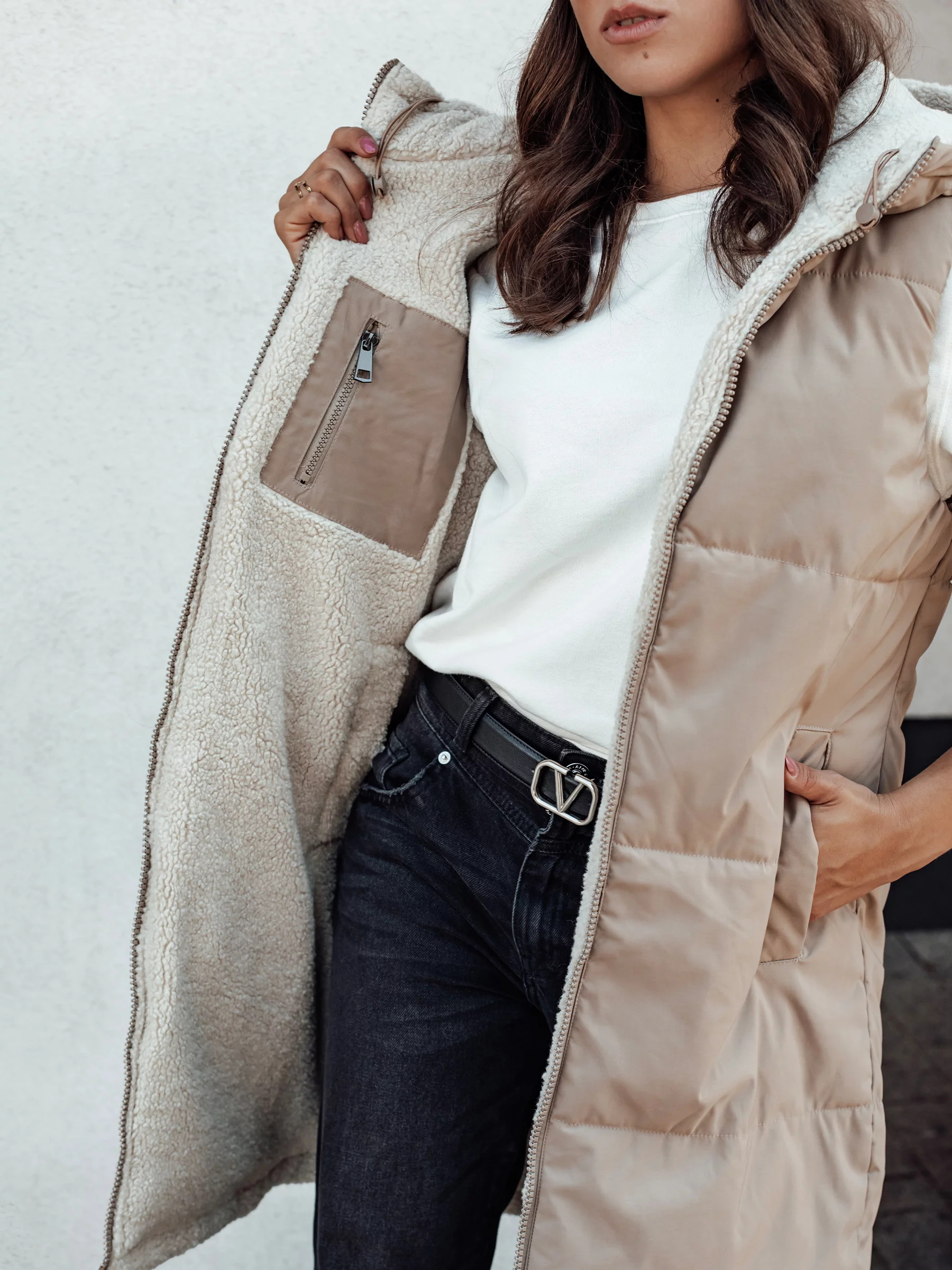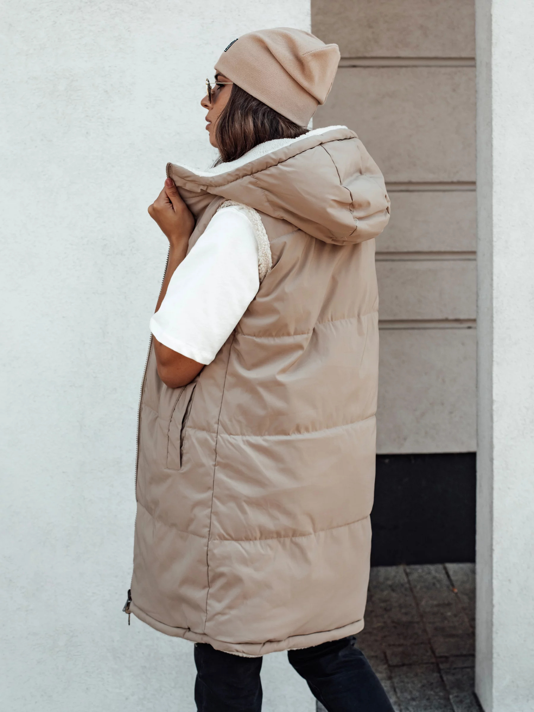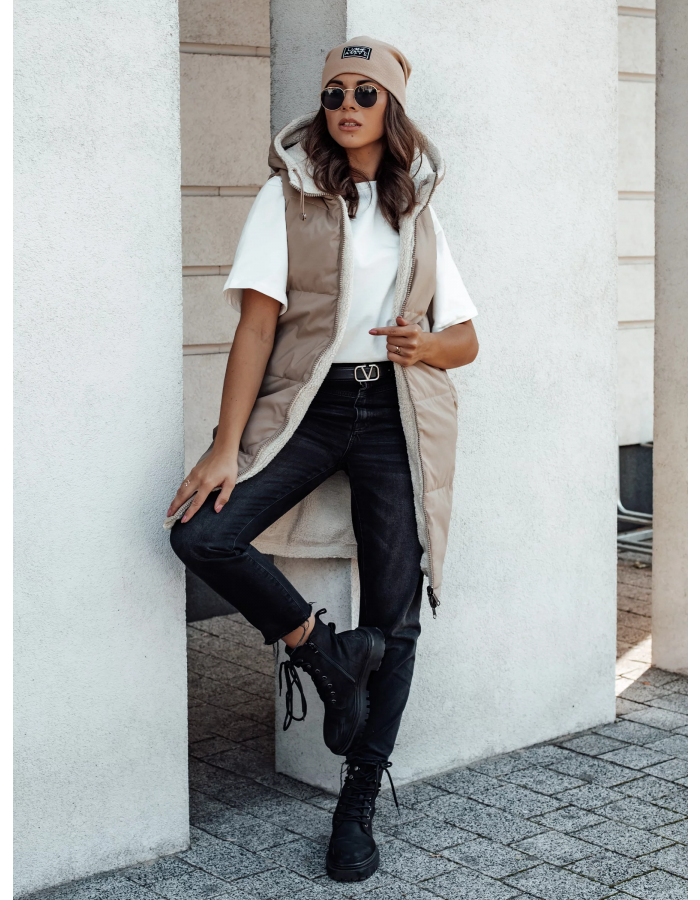Dlouhá vesta s kapucí, vyrobená z lehkého materiálu, se hodí do každého každodenního outfitu.