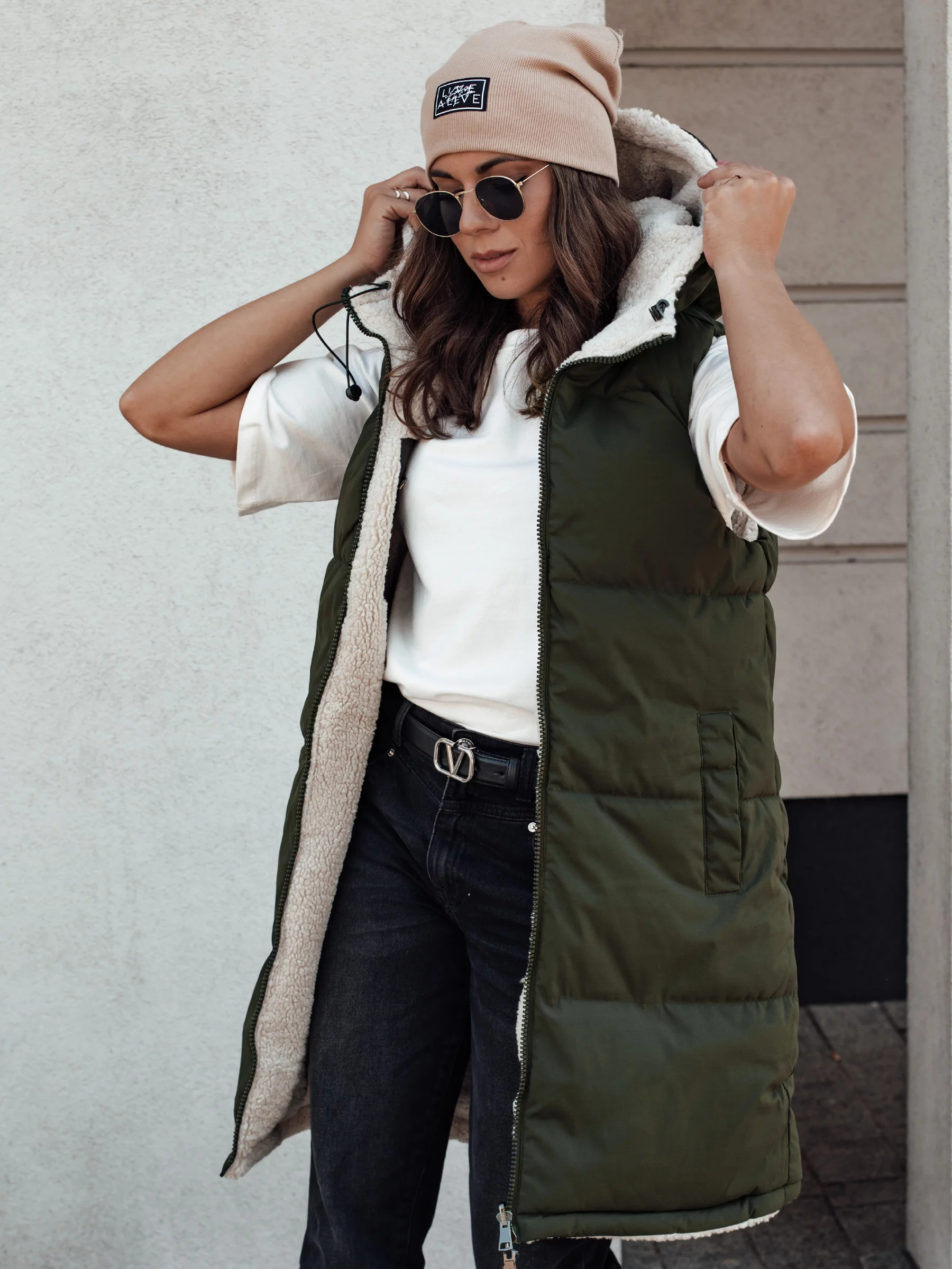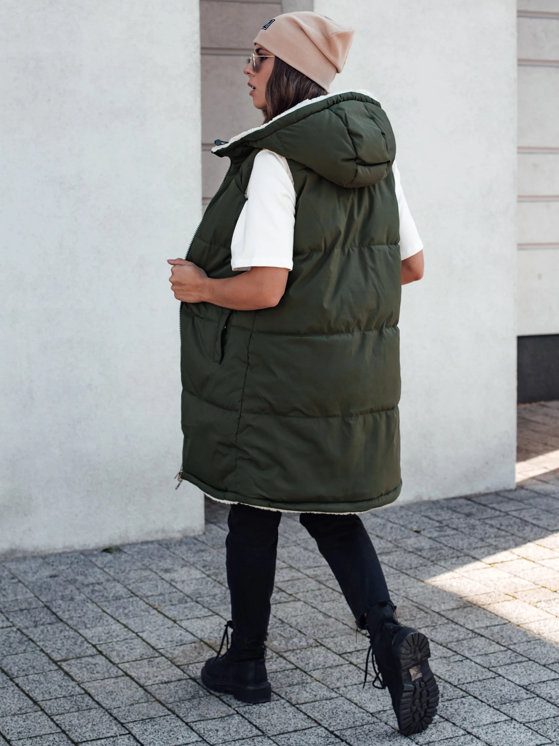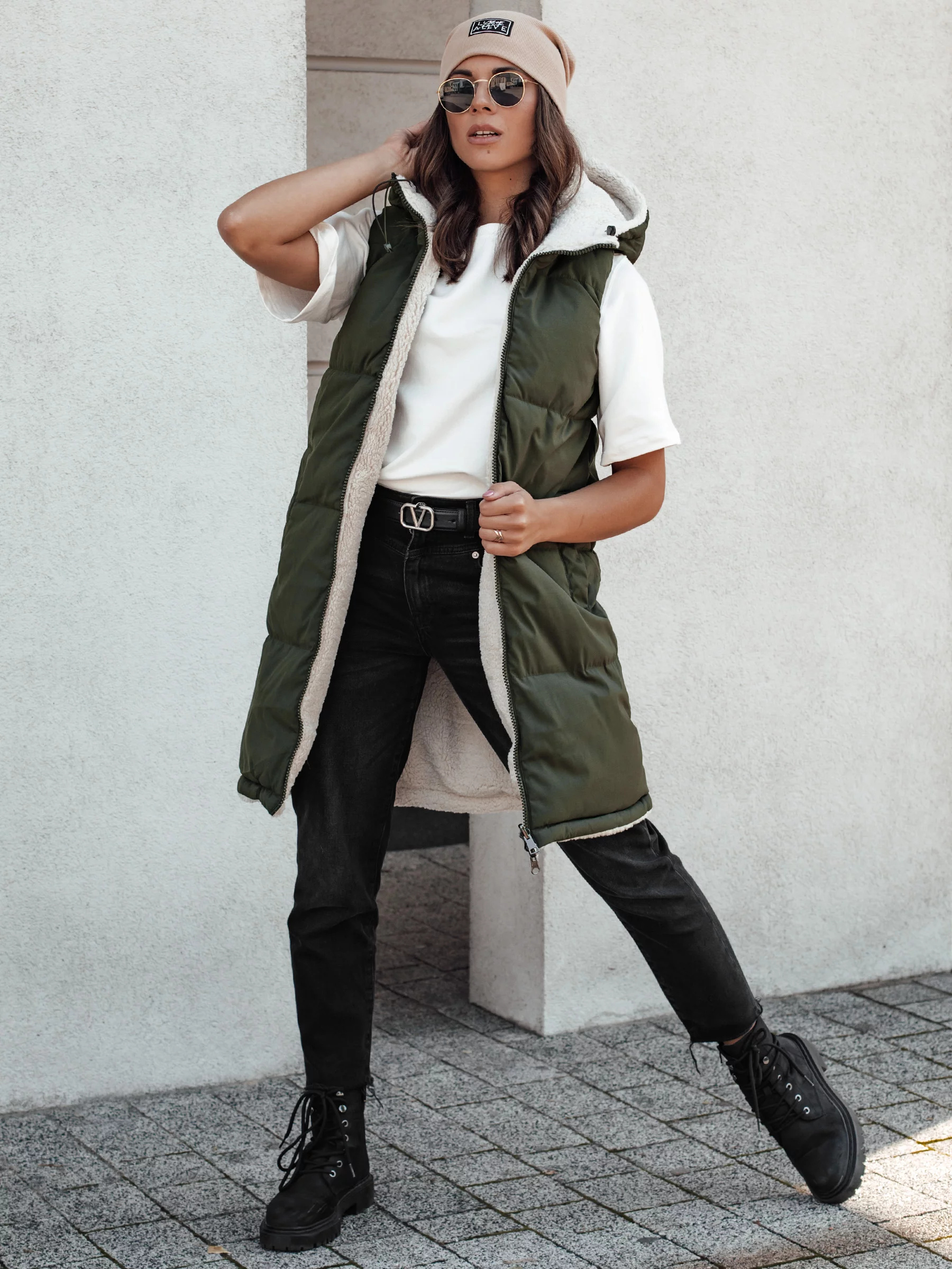 Dlouhá vesta s kapucí, vyrobená z lehkého materiálu, se hodí do každého každodenního outfitu.
