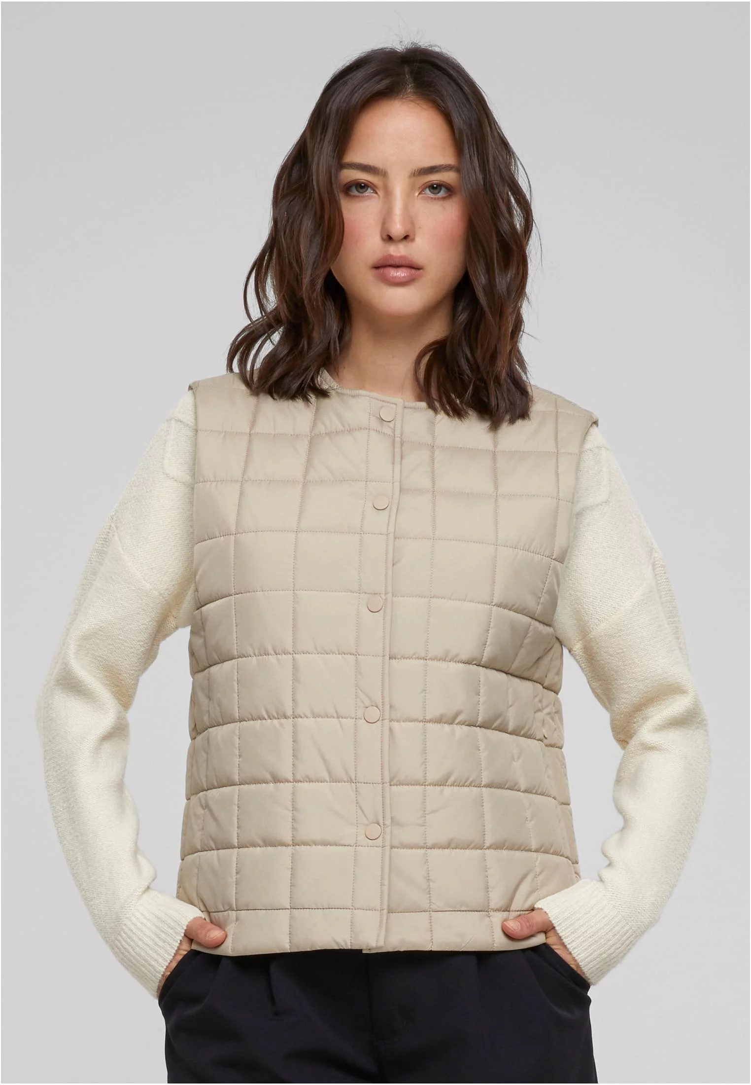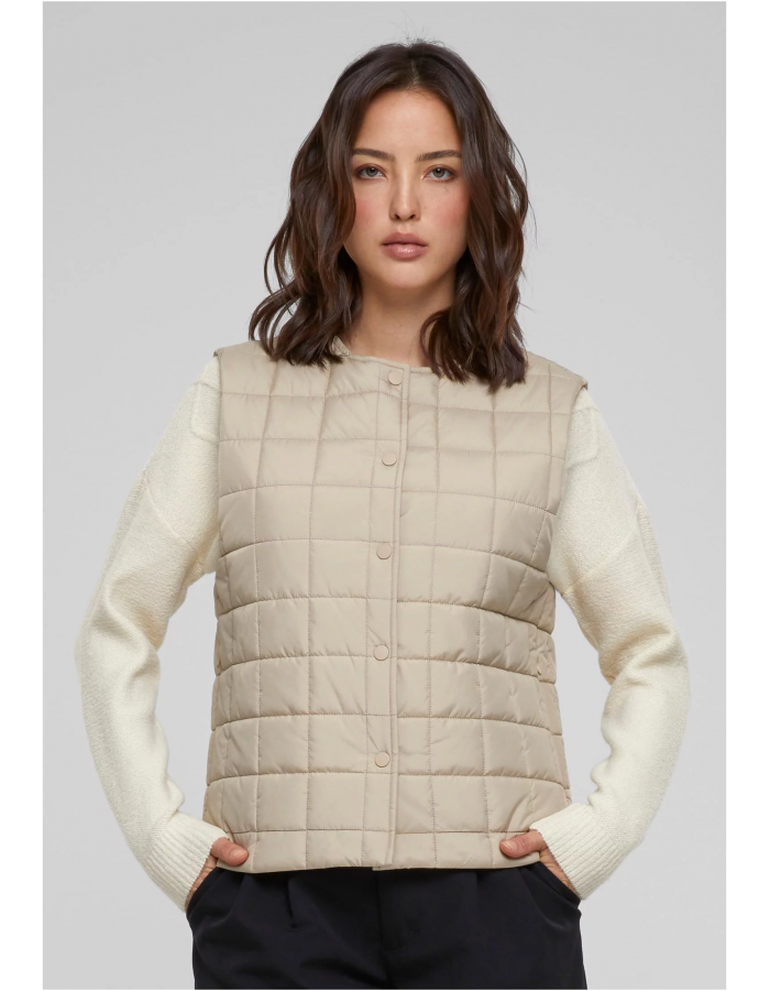 Dámská vesta má obdélníkový design přikrývky s mírně vycpanými čtverci, které také nabízejí stabilitu. Zvolený volný střih dokonale ladí s designem. Vesta se snadno obléká pomocí léga na knoflíky a je vybavena výstřihem. Vnější materiál je robustní Terylen, vnitřek je podšitý jemným taftem.