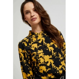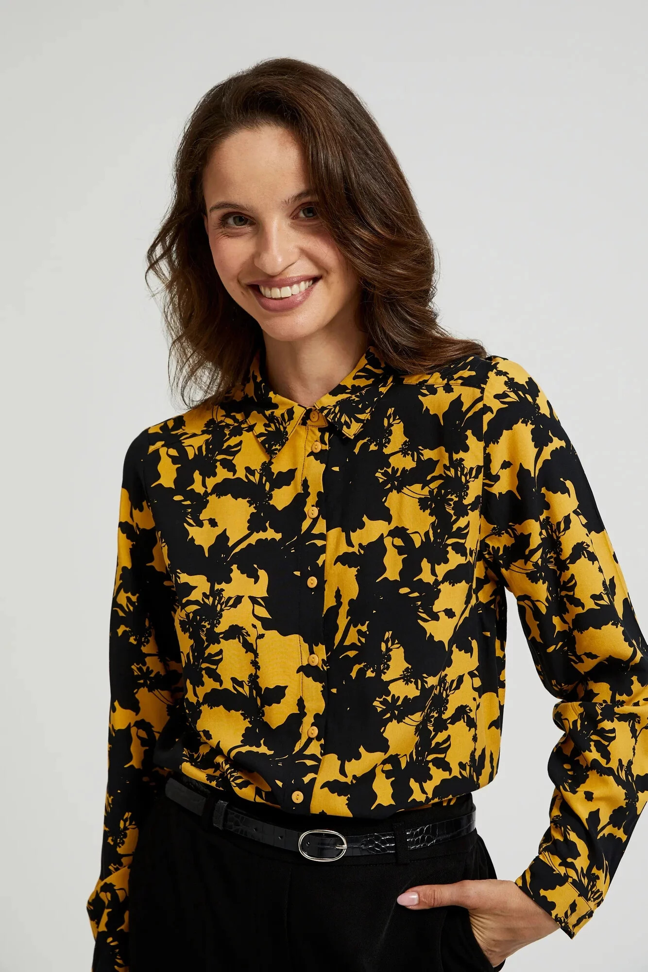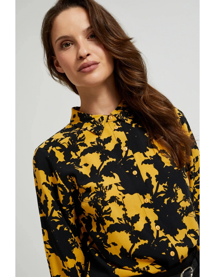 100% VISKÓZA Dámská košile v hořčicové barvě s jemnými vzory květin a listů. Vyrobena z příjemné na dotek viskózy, což zajišťuje, že je velmi pohodlná na nošení. Má dlouhý rukáv s manžetami a límeček. Ideální pro různé příležitosti, jak do práce, tak na setkání s přáteli. Dokonale se hodí jak k sukním, tak k kalhotám. Dodává stylový a ženský vzhled každé stylizaci.