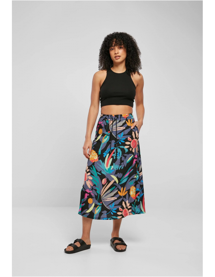 Dámská sukně v květinovém stylu jemně padá po nohách a dosahuje až k lýtkům. Kromě volného střihu nabízí elastický pas s integrovanou stahovací šňůrkou bezpečné a pohodlné nošení. Praktickým detailem jsou boční kapsy. Moderní sukně je vyrobena z hladké, tkané viskózy.