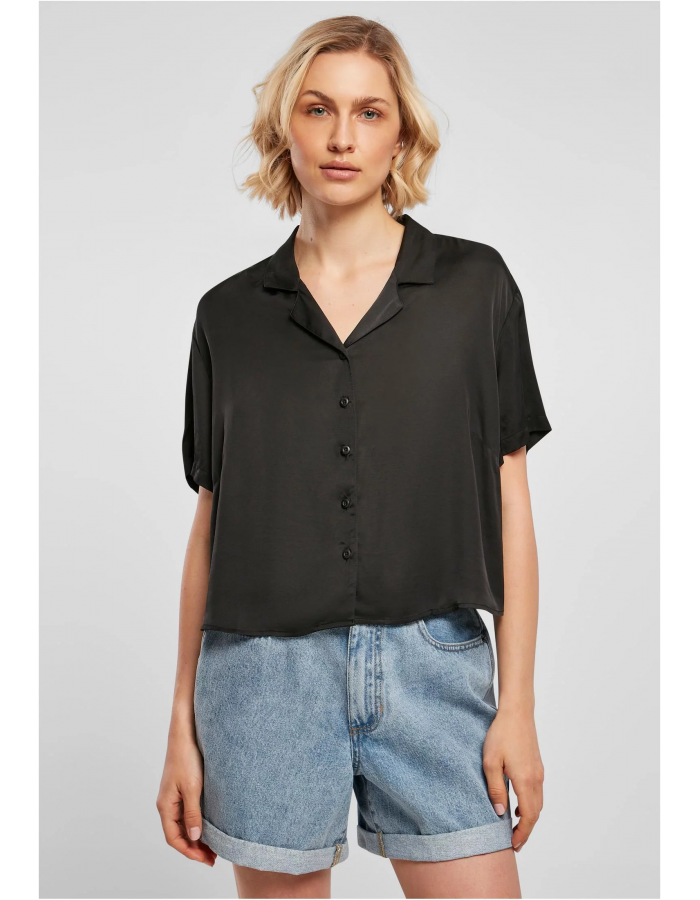 Tato moderní a minimalistická dámská halenka je zredukována na to nejnutnější. Předností je jemný klopový límec a jemná knoflíková léga. V koordinovaném kontrastu jsou ležérní volný střih a krátký střih halenky s krátkým rukávem, který sahá těsně nad boky. Je vyrobena z jemné saténové látky.