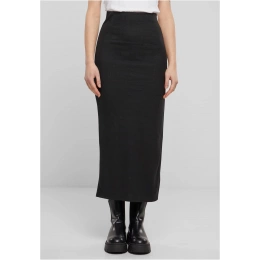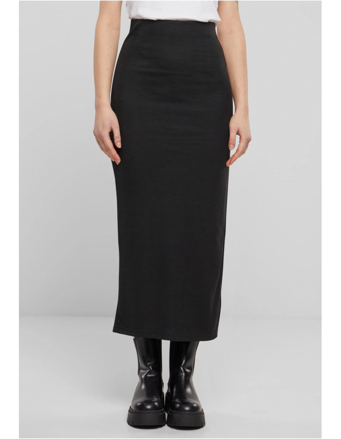 Sukně sahá do poloviny lýtek a má vysoký pas, což vytváří elegantní a prodlouženou siluetu. Je vyrobena z pružného materiálu, který pohodlně obepíná postavu. Díky svému jednoduchému designu a neutrální černé barvě je tato sukně velmi univerzální a lze ji snadno kombinovat s různými topy a obuví, jak pro formální, tak pro neformální příležitosti. Na obrázku je sukně kombinována s černými koženými botami na platformě, což dodává outfitu moderní a stylový vzhled.