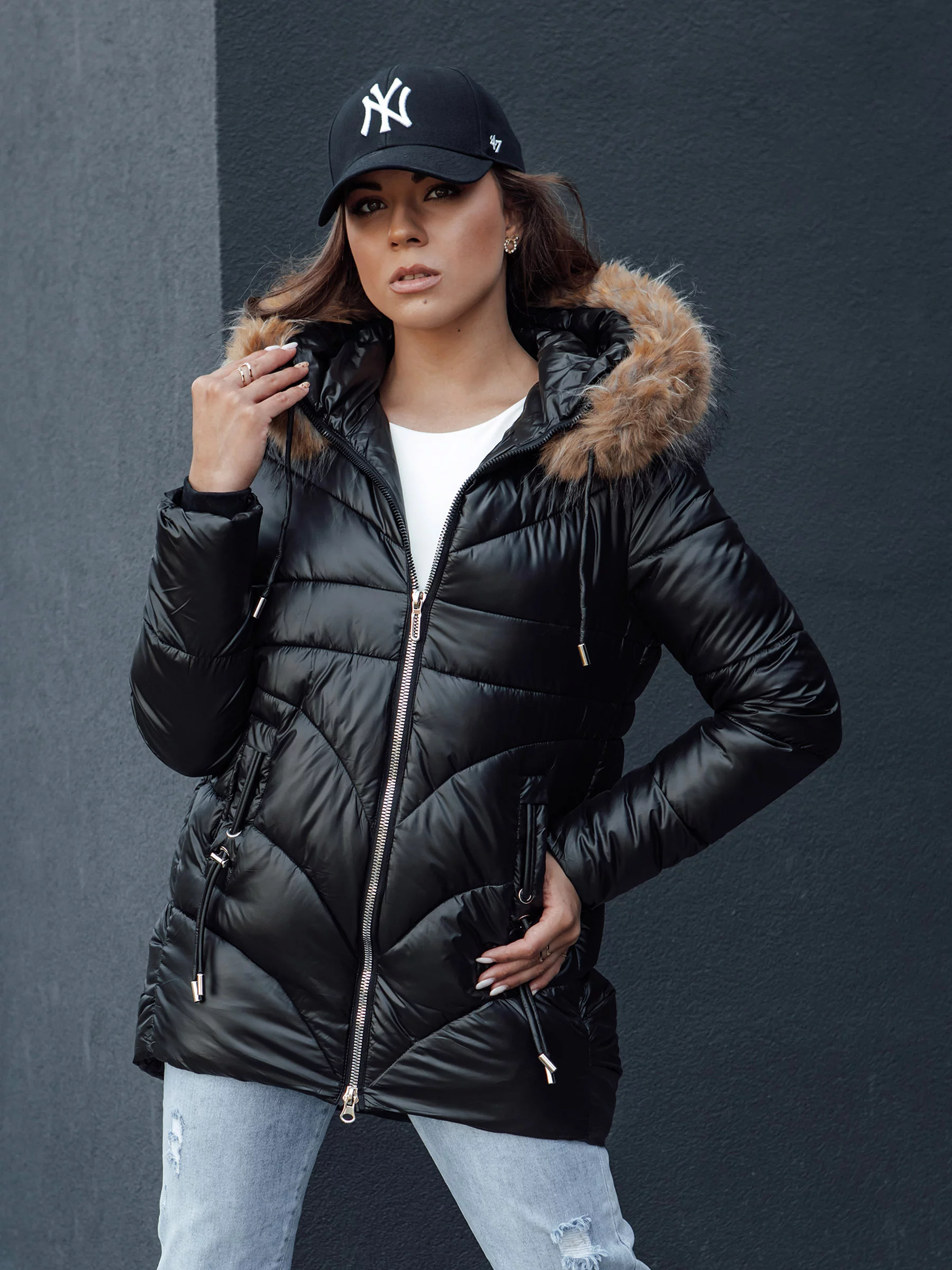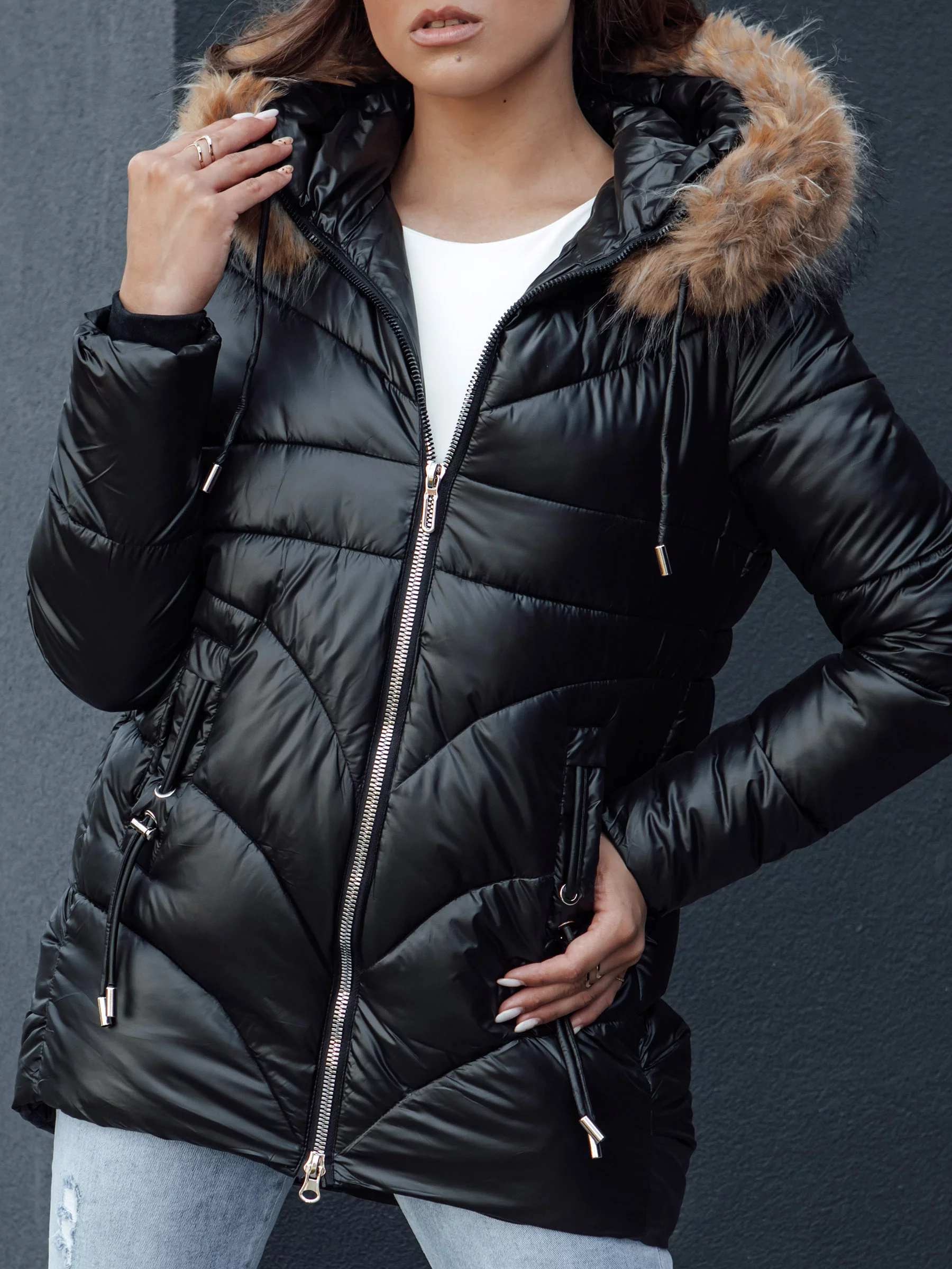 Naše bunda je kombinací módy a praktičnosti. Díky zapínání na zip je její oblékání a svlékání rychlé a snadné. Odepínací kapuce s kožešinou dodává eleganci a zároveň umožňuje přizpůsobení bundy počasí. Dvě vnější kapsy jsou ideální pro uložení nejpotřebnějších věcí a stahovací šňůrky na spodním lemu a rukávech účinně chrání před větrem, zajišťují teplo. To je ideální bunda na každodenní výlety, které vyžadují stylový vzhled a spolehlivou ochranu před chladem.