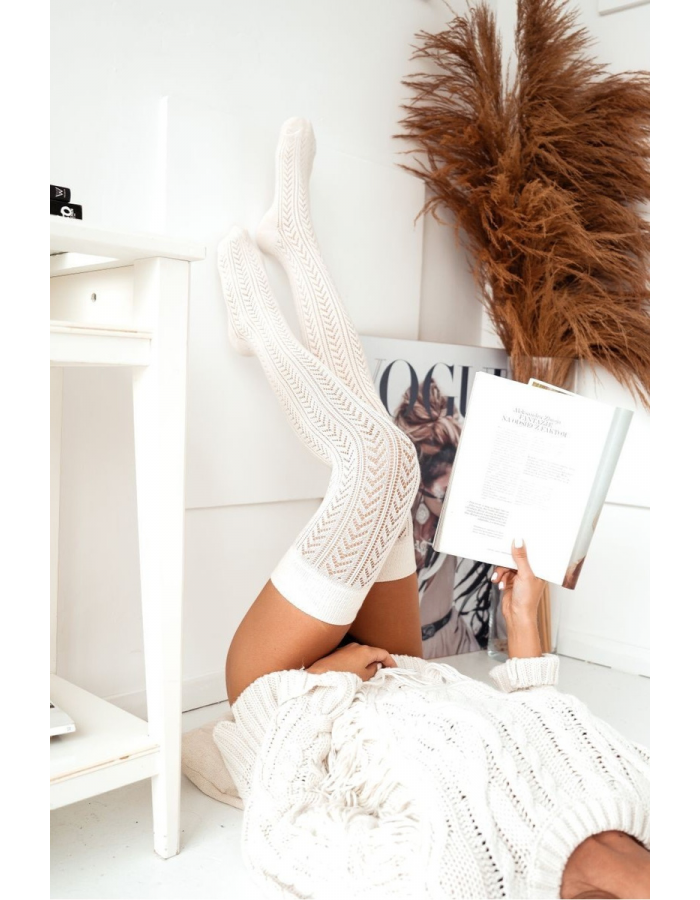 Dámské nadkolenky v ažurovém provedení zaujmou jemným vzorem rybí kost, který působí elegantně a zároveň lehce. Barva ecru se snadno kombinuje s neutrálními i výraznějšími tóny, takže se hodí k šatům, sukním i delším svetrům. Díky dekorativnímu úpletu jsou nadkolenky skvělým doplňkem pro každodenní nošení i pro chvíle, kdy chcete outfit doladit výraznějším detailem.