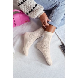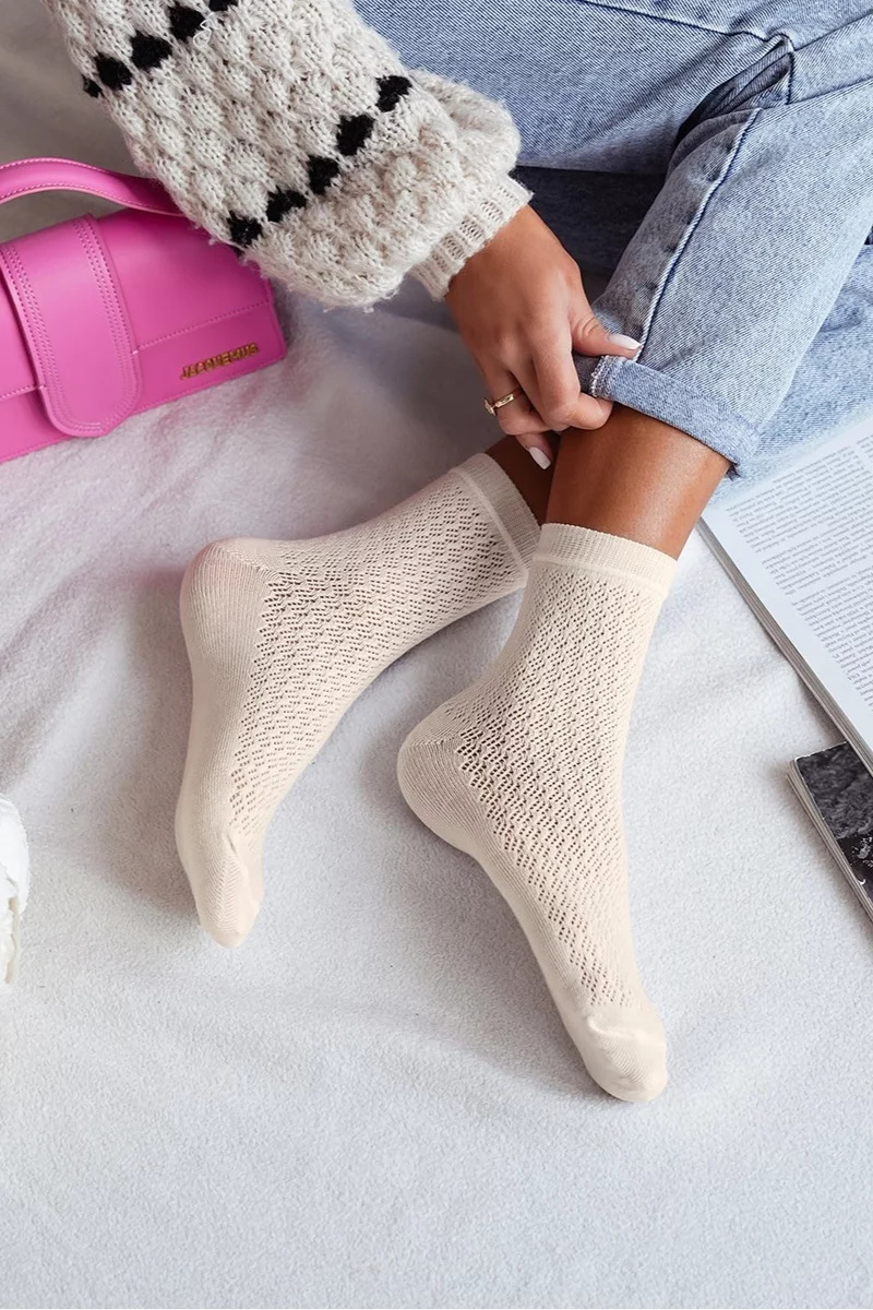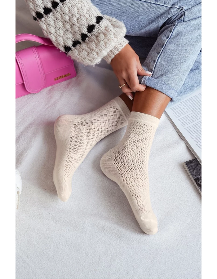 Ecru dámské azurové ponožky jsou měkké, pohodlné a ideální pro každodenní nošení. Lehký a prodyšný vzor dodává ponožkám elegantní vzhled a příjemný pocit na noze. Jemná ecru barva je nadčasová a snadno kombinovatelná s různou obuví a outfity.
