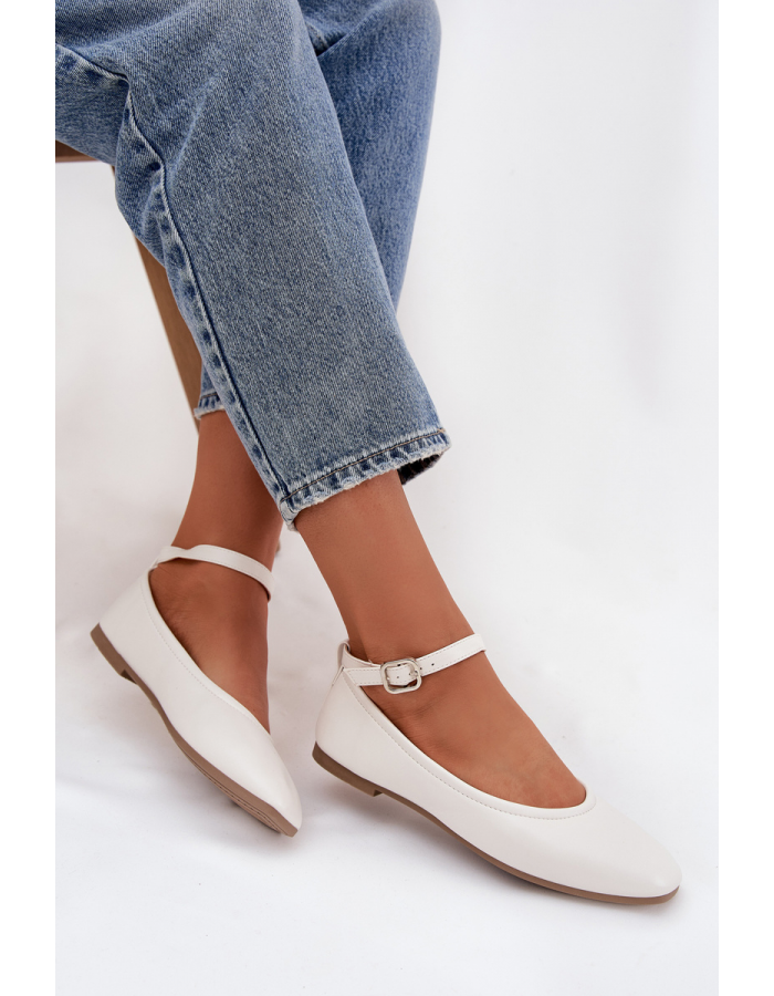 Bílé baleríny Janelor doporučujeme kombinovat s barevným i neutrálním oblečením, aby páska s přezkou byla elegantním akcentem outfitu.