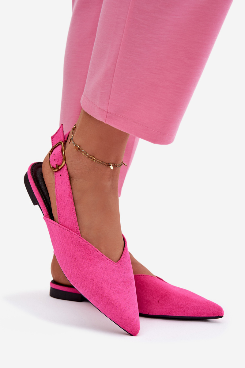 Růžové baleríny se zlatou přezkou krásně doplní světlé šaty, sukně nebo outfit v neutrálních tónech a dodají mu jemný, elegantní nádech.