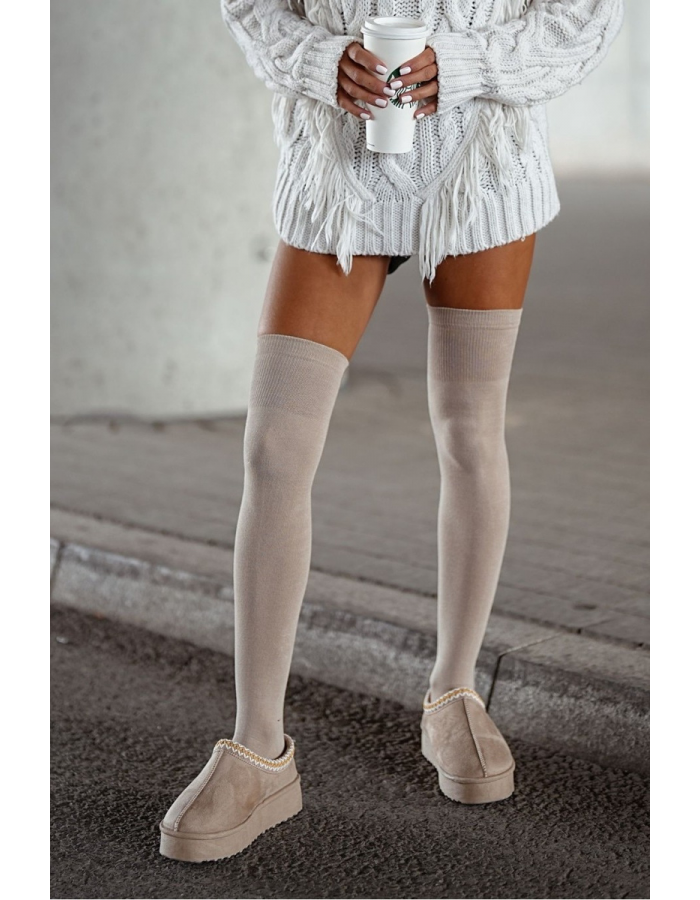 Dámské nadkolenky jsou vyrobené z příjemné bavlněné pleteniny a díky hladkému, jednobarevnému provedení se snadno kombinují s většinou outfitů. Béžová barva působí nenápadně a elegantně, takže se hodí jak na běžné nošení, tak i k šatům nebo sukni v chladnějších dnech. Nadkolenky jsou pohodlné pro celodenní nošení a poslouží i jako stylový doplněk pod kozačky.