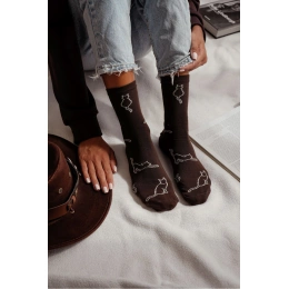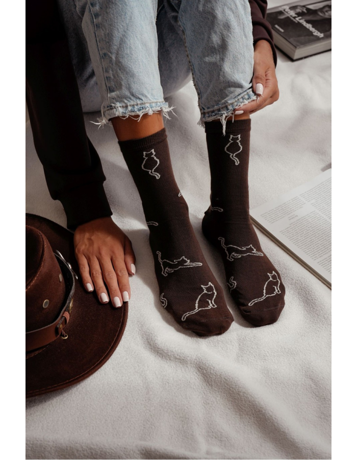 Roztomilé dámské ponožky v tmavě hnědém odstínu s motivem kontury kočky. Měkký bavlněný materiál zajišťuje pohodlí a prodyšnost, vhodné pro každodenní nošení doma i venku.