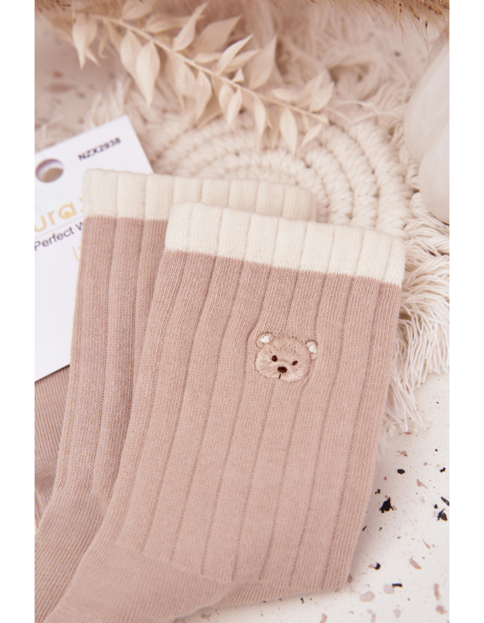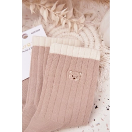 Pohodlné a měkké dámské bavlněné ponožky v jemně béžové barvě s roztomilým motivem malého medvídka. Díky vysokému podílu bavlny jsou příjemné na dotek, prodyšné a vhodné pro celodenní nošení. Elastický lem zajistí, že dobře drží na noze, aniž by ji nepříjemně stahovaly.