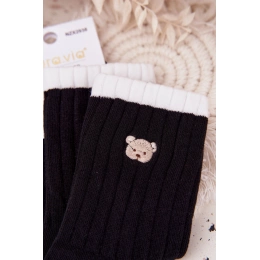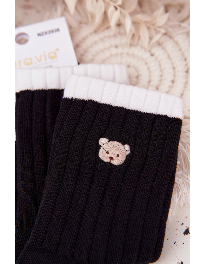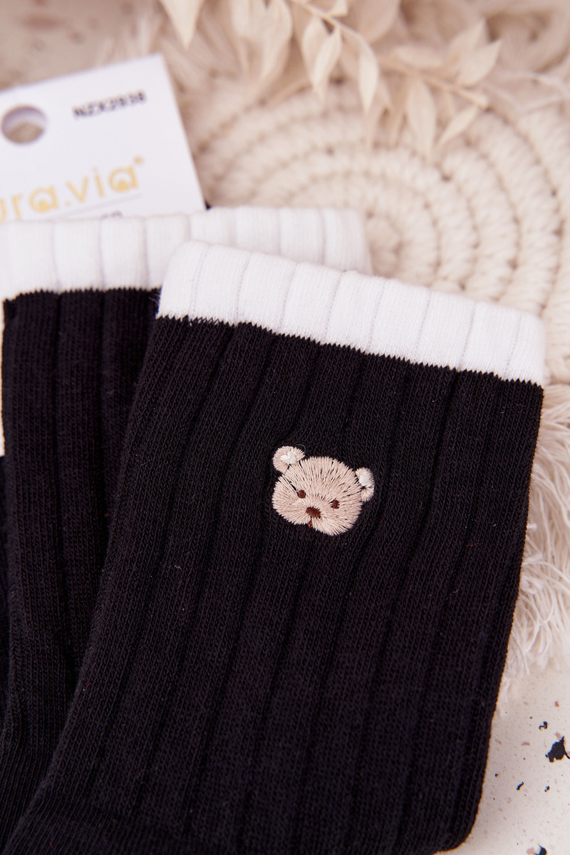 Pohodlné a měkké dámské bavlněné ponožky v elegantní černé barvě s roztomilým motivem malého medvídka. Díky vysokému podílu bavlny jsou prodyšné, příjemné na dotek a vhodné pro celodenní nošení. Elastický lem zajišťuje, že ponožky drží na noze bez nepříjemného stahování.