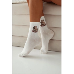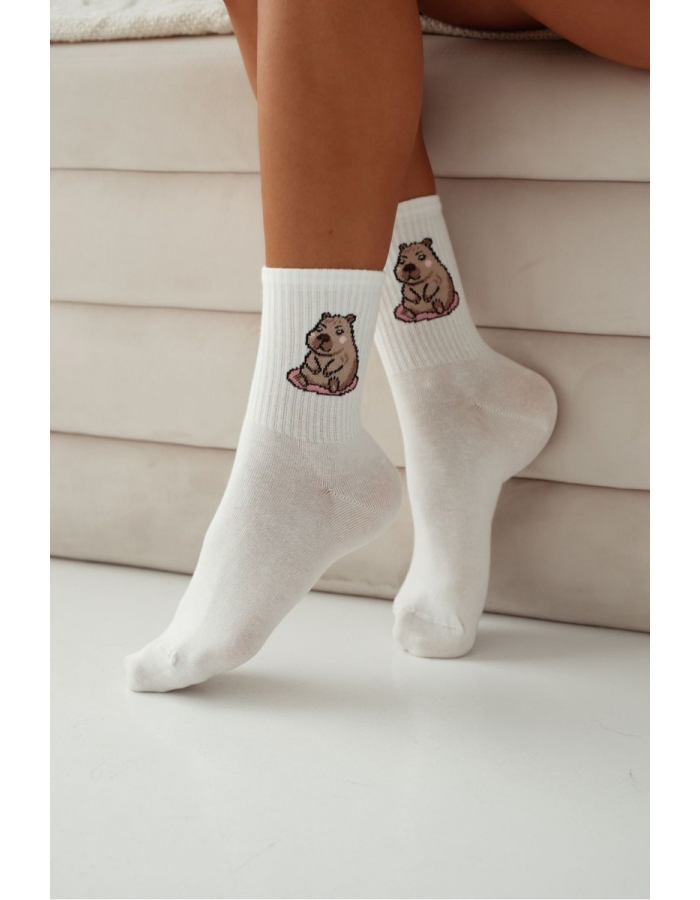 Ecru dámské bavlněné ponožky s motivem sedící kapibary jsou měkké, pohodlné a ideální pro každodenní nošení. Kvalitní materiál zajišťuje příjemný pocit po celý den a dobrou prodyšnost.