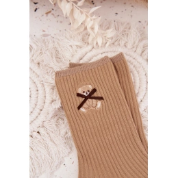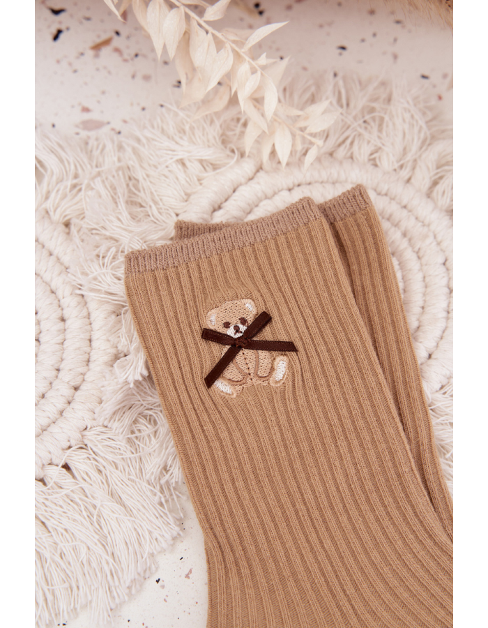 Bavlněné ponožky v žebrovaném provedení jsou příjemné na nošení a díky pružnému úpletu dobře sedí na noze. Roztomilý motiv medvídka dodá outfitu hravý detail, který potěší při každodenním nošení doma i venku. Světle hnědá barva působí teple a snadno se kombinuje s neutrálními i přírodními tóny.