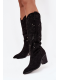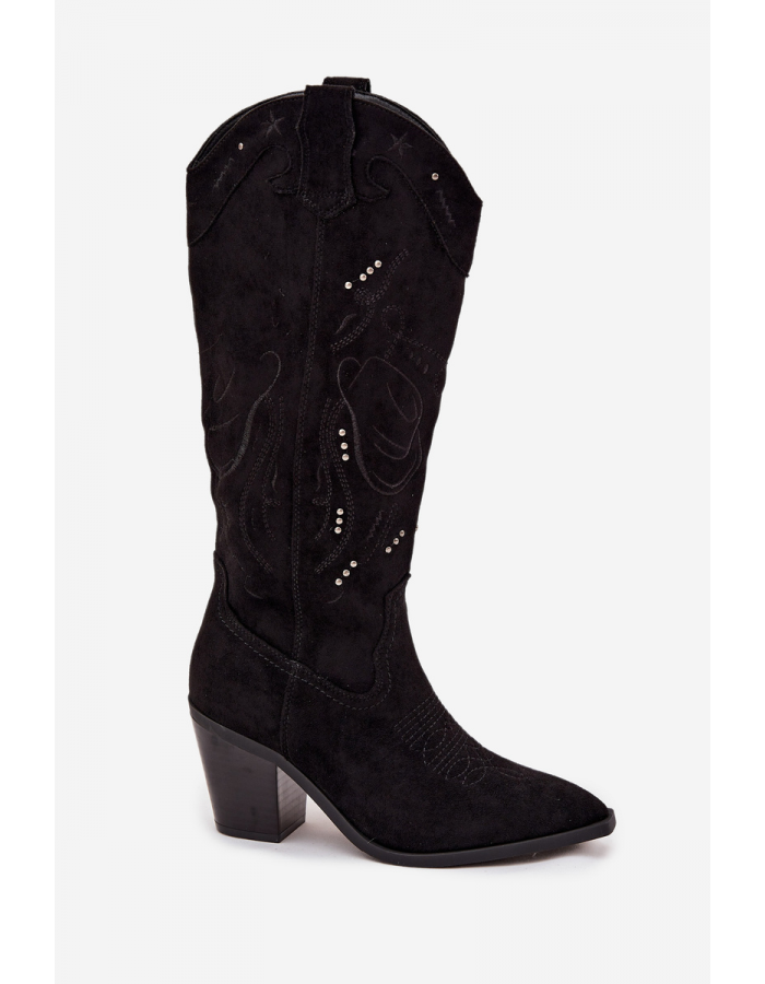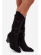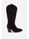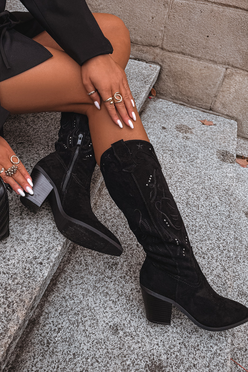 Dámské kozačky v cowboy stylu z eko semiše kombinují klasiku s moderním a výrazným charakterem. Jsou posazené na stabilním, seříznutém sloupkovém podpatku, který opticky zeštíhluje postavu a zároveň zajišťuje pohodlnou chůzi. Model vyniká ozdobnými prošíváními a jemnými zlatými detaily. Mandlové špičky dodávají obuvi ženský vzhled a praktický zip ve spodní části svršku usnadňuje obouvání. Kozačky jsou ideální pro podzimní a zimní outfity – skvěle ladí jak s úzkými kalhotami, tak s boho šaty.
