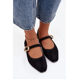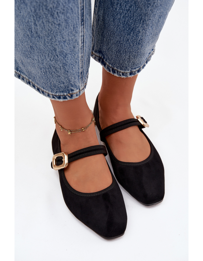 Černé eko semišové baleríny Adelora doporučujeme kombinovat s neutrálním oblečením, aby zlatá přezka byla výrazným akcentem outfitu.