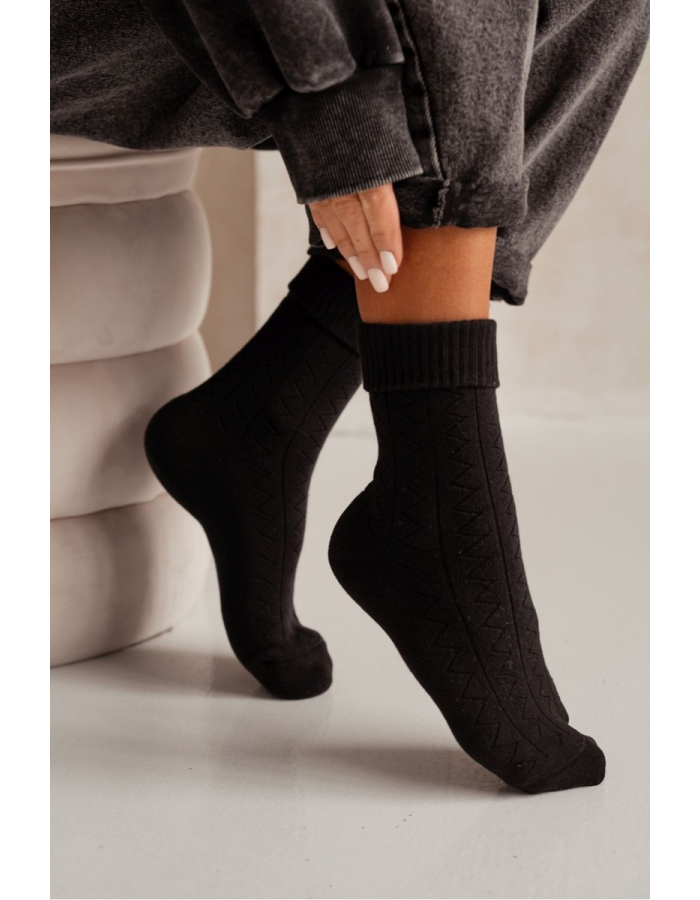 Dámské černé froté ponožky se vzorem cikcak jsou ideální volbou, když chcete extra pohodlí a příjemně hřejivý pocit. Froté úplet je měkčí a nadýchanější, takže se ponožky dobře nosí i během delších dnů a jsou skvělé do chladnějšího počasí. Vzor cikcak dodává ponožkám nenápadný, ale stylový detail, který oživí jednoduchý outfit. Černé provedení je praktické a snadno kombinovatelné, takže ponožky využijete doma i venku v běžné obuvi.