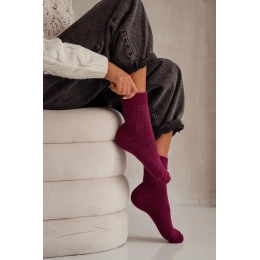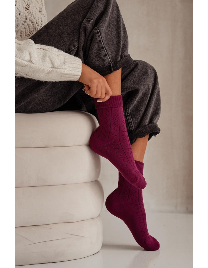 Bordó dámské froté ponožky se vzorem zygzaku jsou měkké, pohodlné a vhodné pro každodenní nošení. Kvalitní materiál zajišťuje příjemný pocit po celý den a dobrou prodyšnost.
