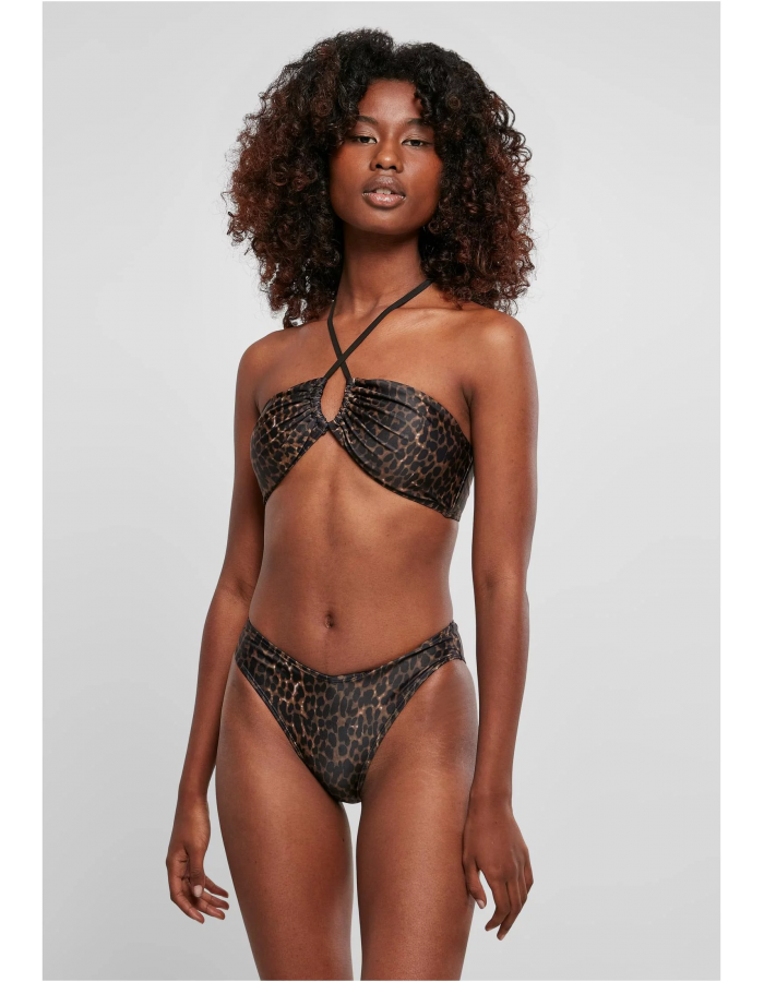 Tyto bikiny okouzlí svým tvarem a barvou. Svršek je vyroben jako bandeau top s centrálním volánem a překříženým páskem na krk. Kalhotky mají sportovní tvar V s vysokými výřezy nohavic. Design dotváří letní celoplošný potisk. Bikiny jsou vyrobeny z polyesteru, elastanu a strečových plavek a mají polyesterovou podšívku.