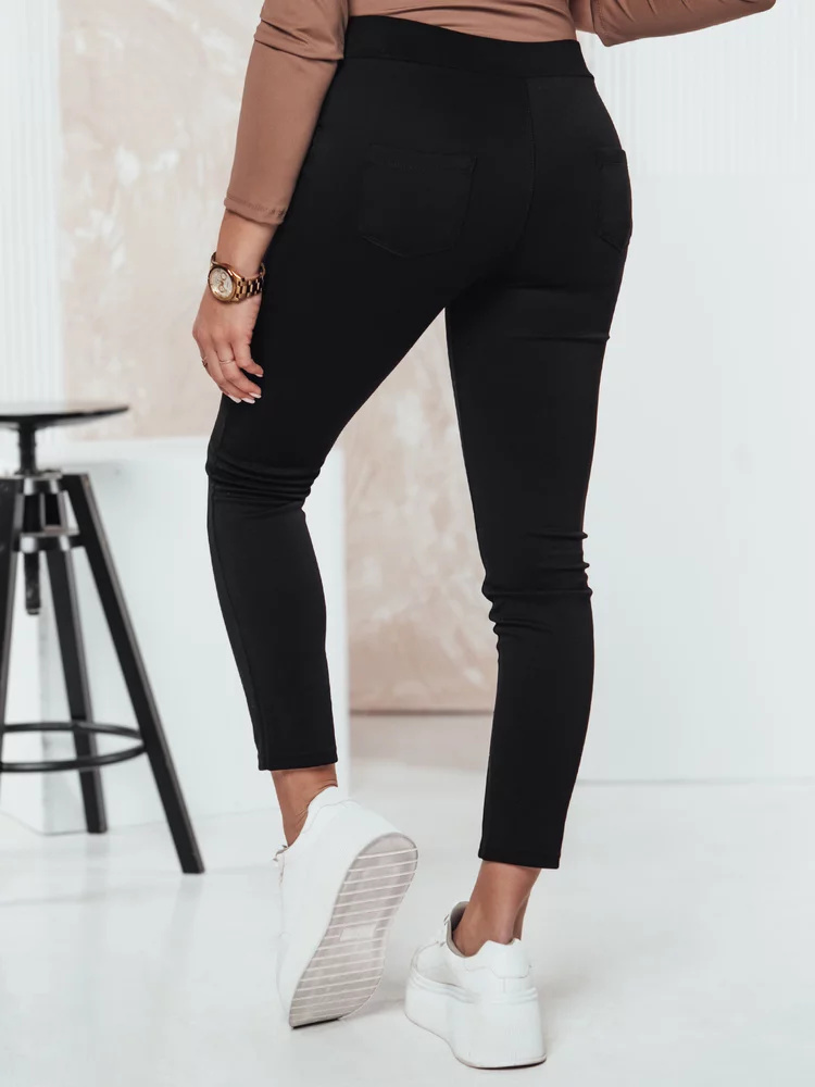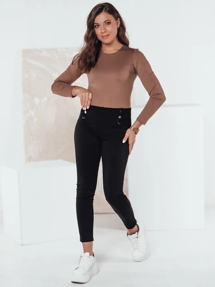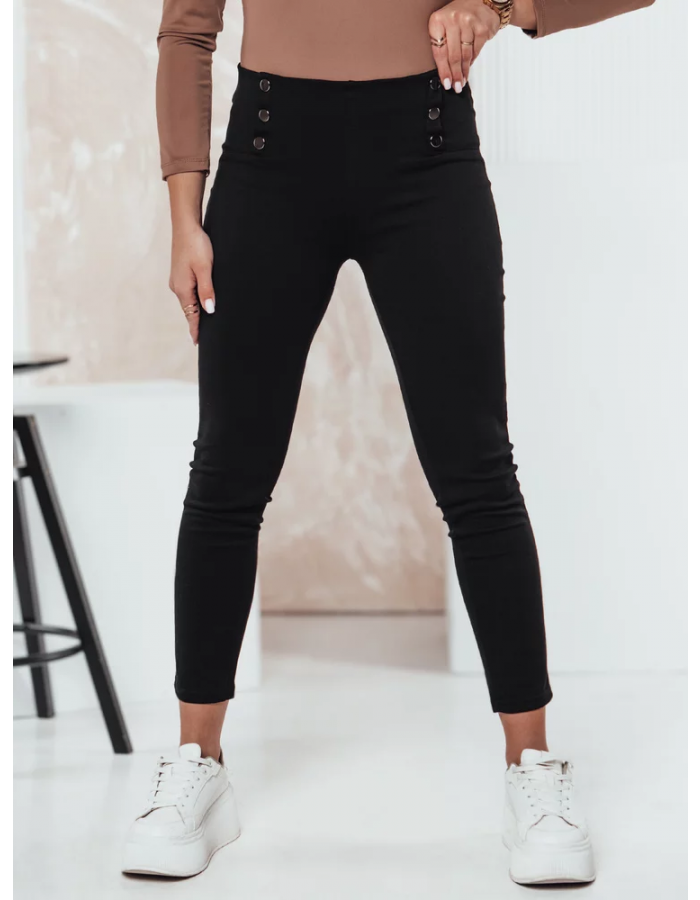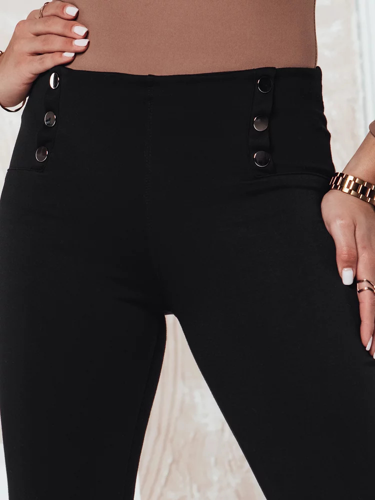 Přiléhavé kalhoty s vysokým pasem zajišťují výjimečné pohodlí při nošení a moderní vzhled. Dekorativní knoflíky dodávají jedinečný charakter a elastický materiál zdůrazňuje siluetu. Ideální pro každodenní stylizace nebo elegantní kombinace na večer.