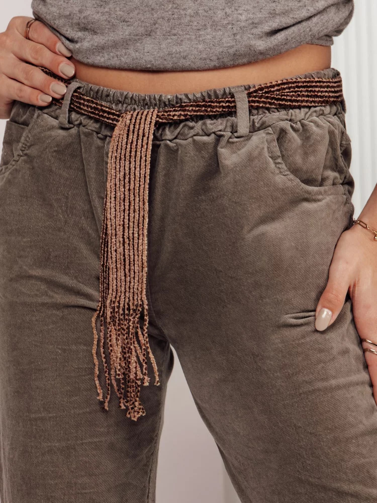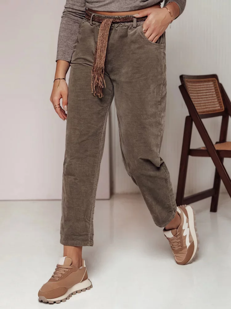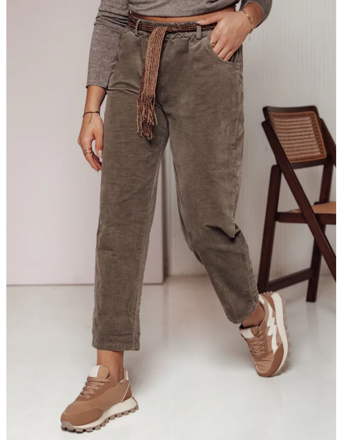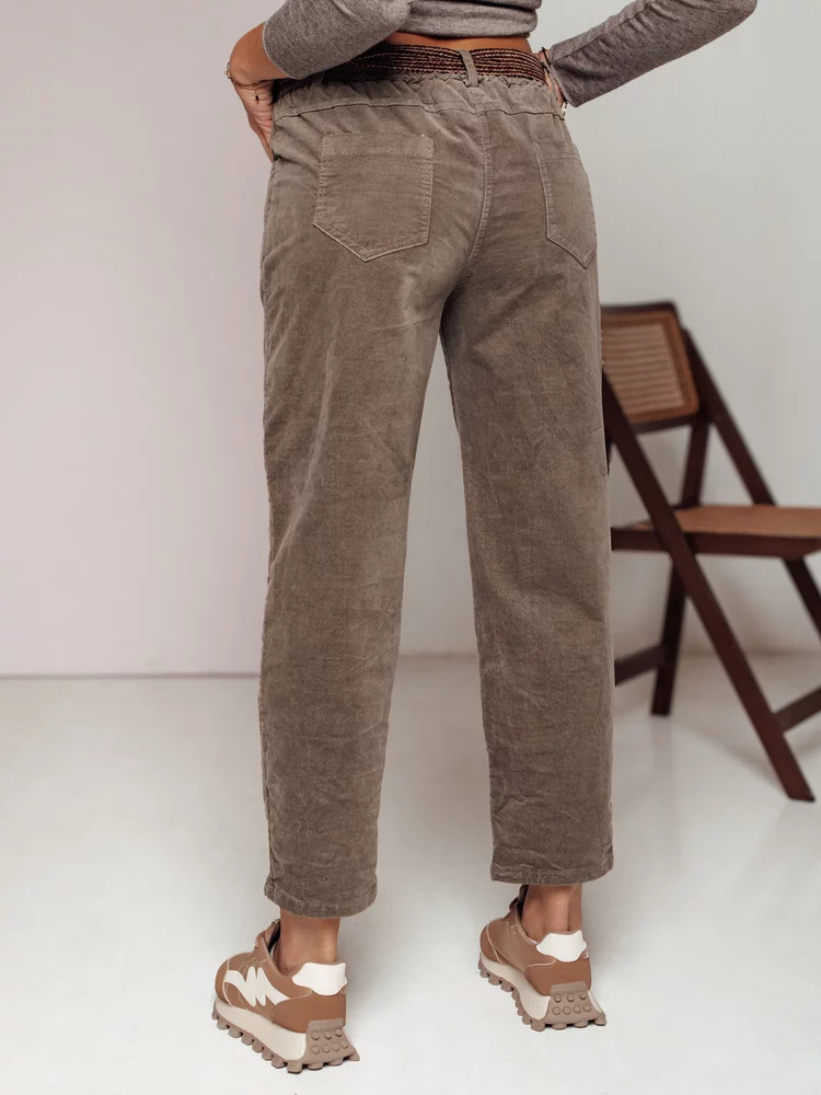 Manšestrové kalhoty s originálním, vázaným páskem jsou nabídkou pro milovnice stylového komfortu. Měkká tkanina a volný střih zajišťují, že jejich nošení je čistá radost. Ideální pro každodenní stylizace, jsou skvělým doplňkem šatníku každé ženy, která si cení pohodlí spojeného s elegancí.