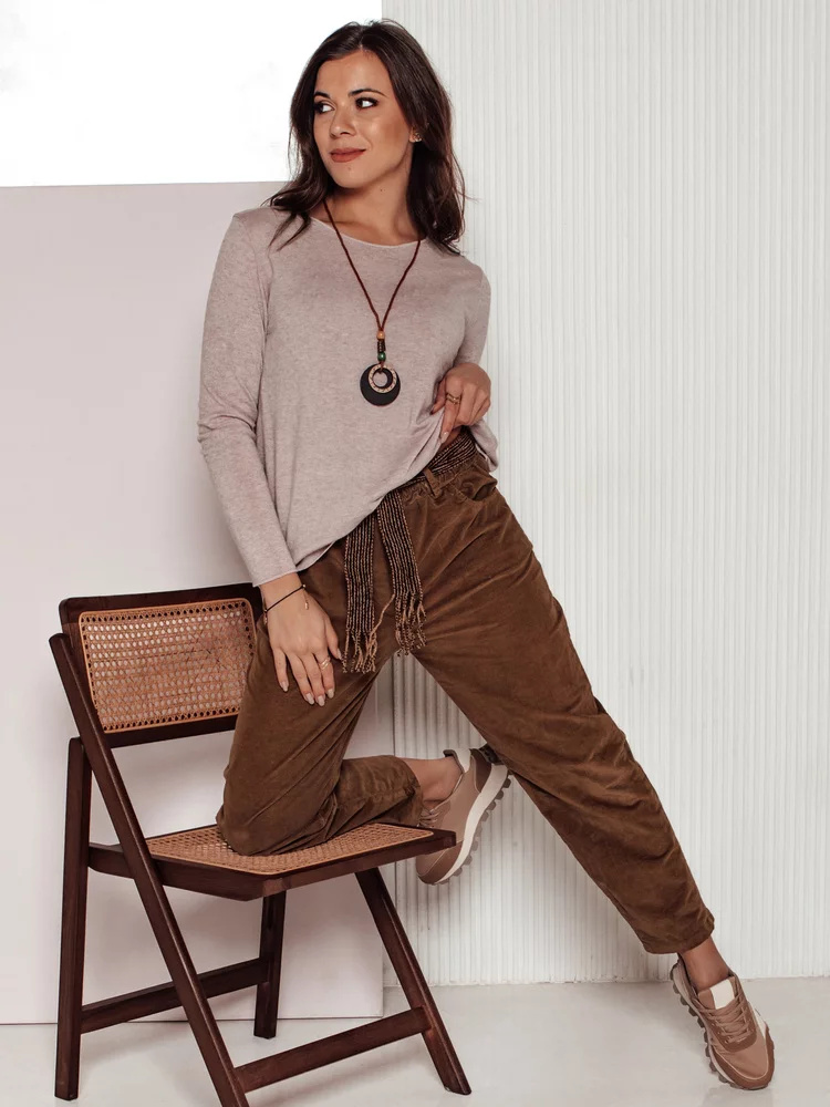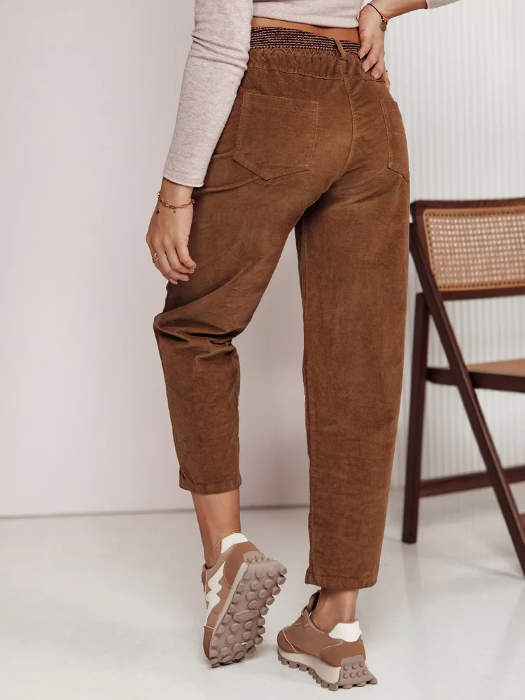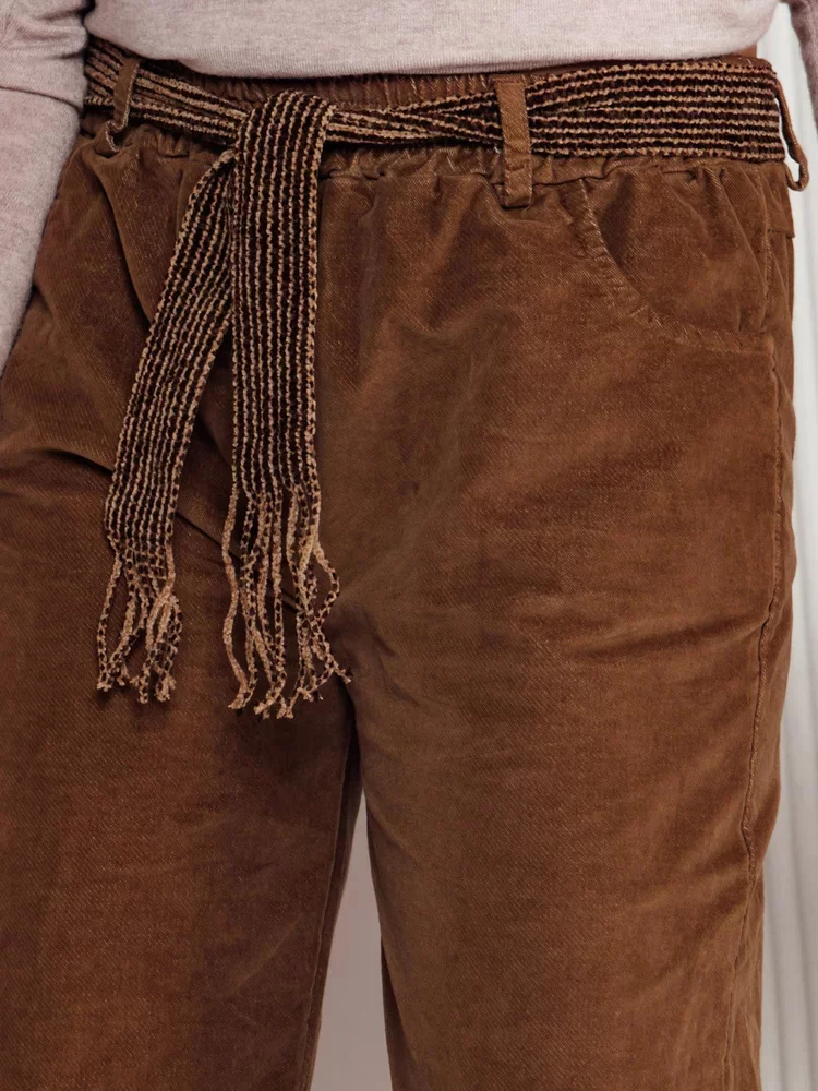 Manšestrové kalhoty s originálním, vázaným páskem jsou nabídkou pro milovnice stylového komfortu. Měkká tkanina a volný střih zajišťují, že jejich nošení je čistá radost. Ideální pro každodenní stylizace, jsou skvělým doplňkem šatníku každé ženy, která si cení pohodlí spojeného s elegancí.