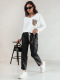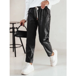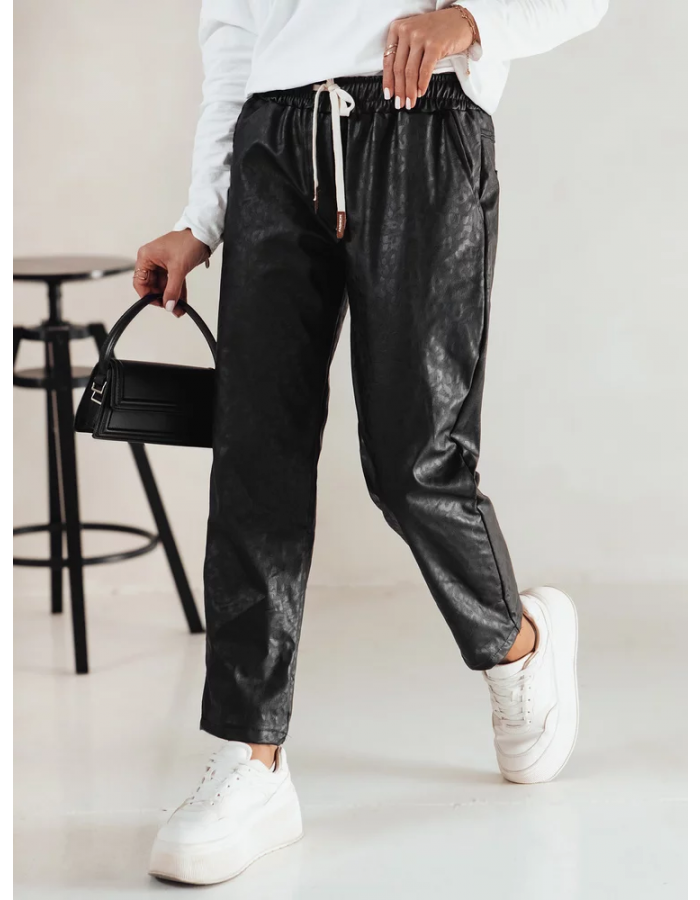Kalhoty s moderním střihem vyrobené z materiálu imitujícího kůži, které spojují styl s funkčností. Elastický pas s vázáním zajišťuje pohodlí a módní detaily dodávají celku výjimečný charakter. Ideální na každodenní vycházky nebo večerní setkání.