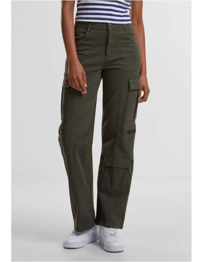 Dámské cargo kalhoty s širokými nohavicemi. Kalhoty mají několik praktických kapes, včetně bočních kapes s klopami a zipy, což přidává funkční a trendy vzhled. Jsou ideální pro ležérní nebo streetwear outfit, pohodlné na nošení a snadno kombinovatelné s teniskami a jednoduchými topy.