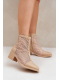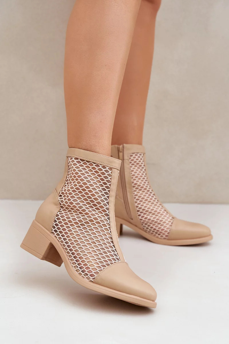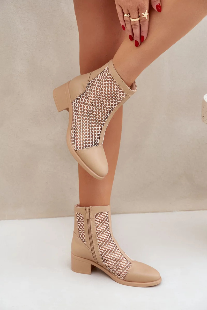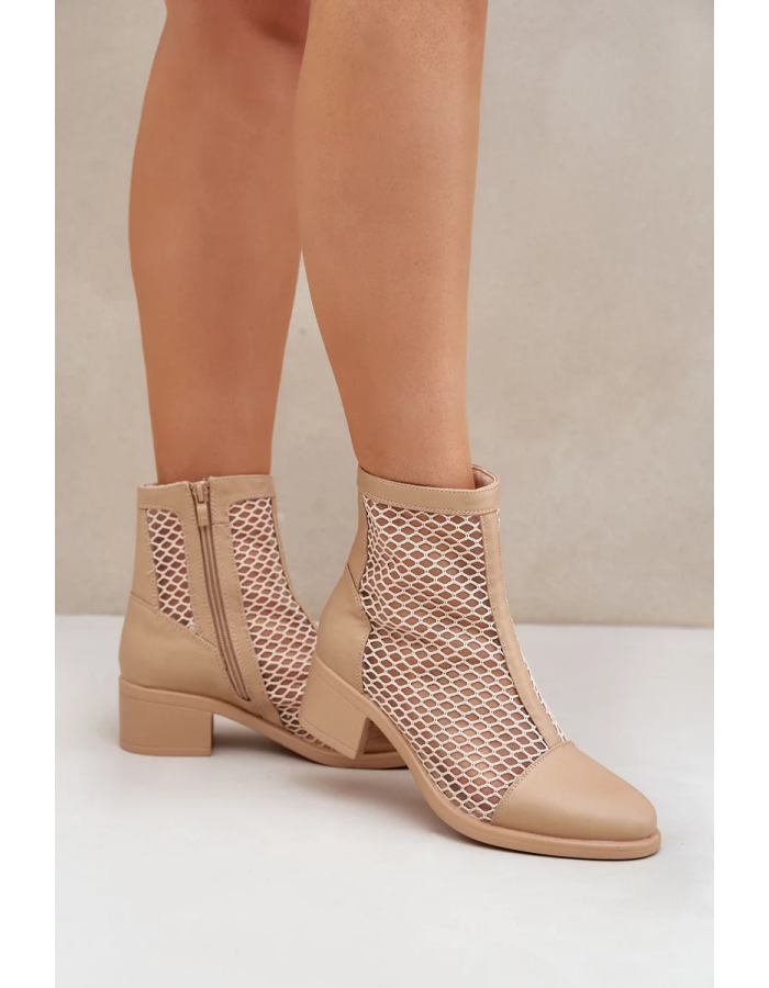 Béžové kotníkové boty Lithyia z eko‑kůže s perforovaným (síťovaným) svrškem a elegantním blokovým podpatkem (~ 6 cm). Mají boční zip pro snadné nazouvání a univerzální design vhodný pro každodenní nošení i elegantní outfity.