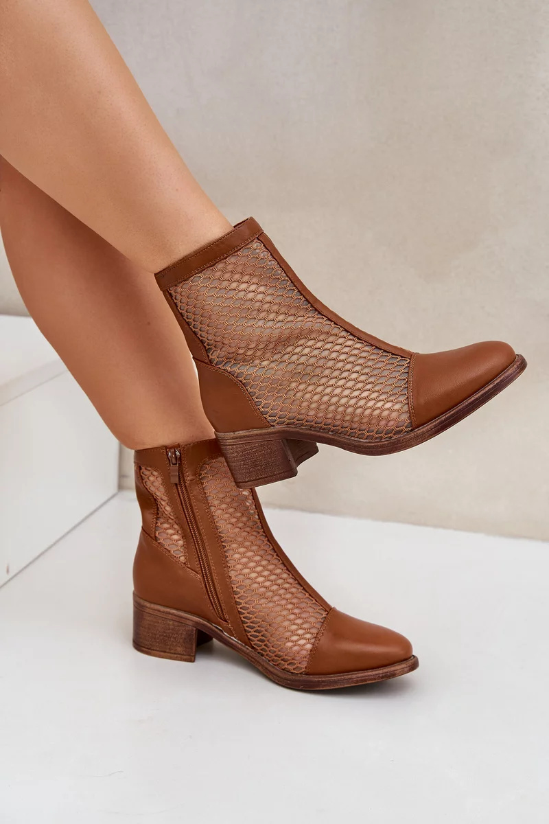Hnědé kotníkové boty Lithyia z eko‑kůže s perforovaným (síťovaným) svrškem a elegantním blokovým podpatkem (~ 6 cm). Mají boční zip pro snadné nazouvání a univerzální design vhodný pro každodenní nošení i elegantní outfity.