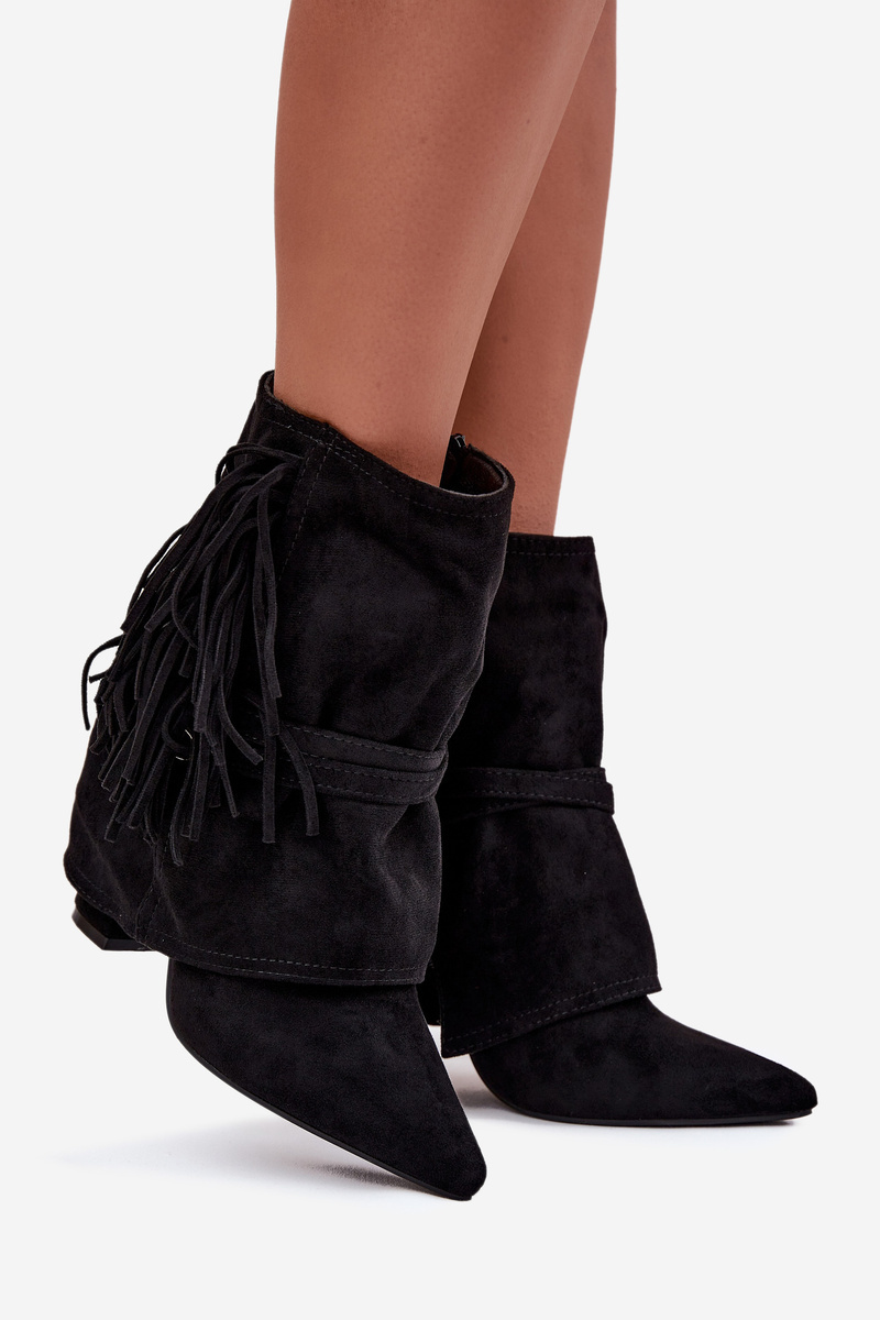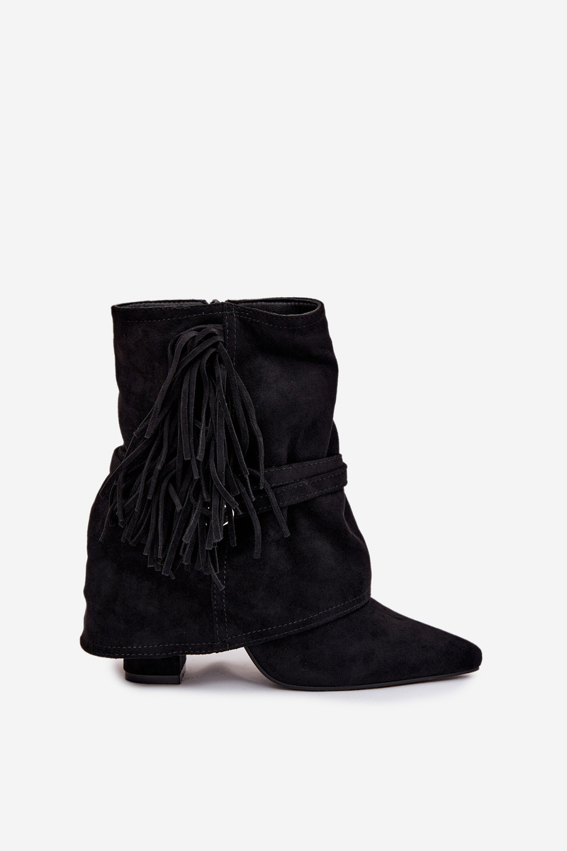 Botky dámské na sloupku kombinují elegantní vzhled s moderními detaily. Model je z eko kůže, osazený stabilním sloupkovým podpatkem, který poskytuje pohodlí při chůzi. Cholevku zdobí třásně a zlaté přezky, které dodávají botám výrazný a stylový akcent. Boční zip zajišťuje snadné obouvání a optimální přizpůsobení chodidlu. Skvěle se hodí k casualovým i elegantnějším outfitům. Velikosti: 36-23,5 / 37-24 / 38-24,5 / 39-25,5 / 40-26 / 41-26,5 cm