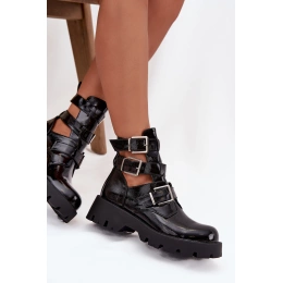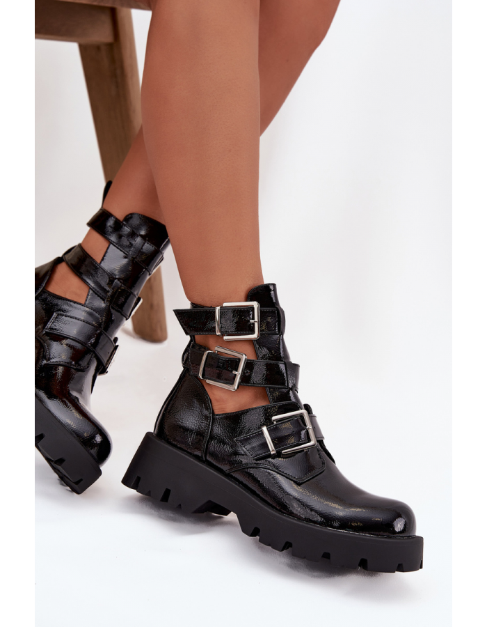 Botky dámské z lakované eko kůže kombinují moderní vzhled s pohodlným nošením. Model je zdoben pásky se stříbrnými přezkami, které dodávají botám elegantní a stylový akcent. Stabilní podpatek zajišťuje pohodlí při chůzi, boční zip usnadňuje obouvání a přizpůsobení bot chodidlu. Skvěle se hodí k casualovým i elegantním outfitům.