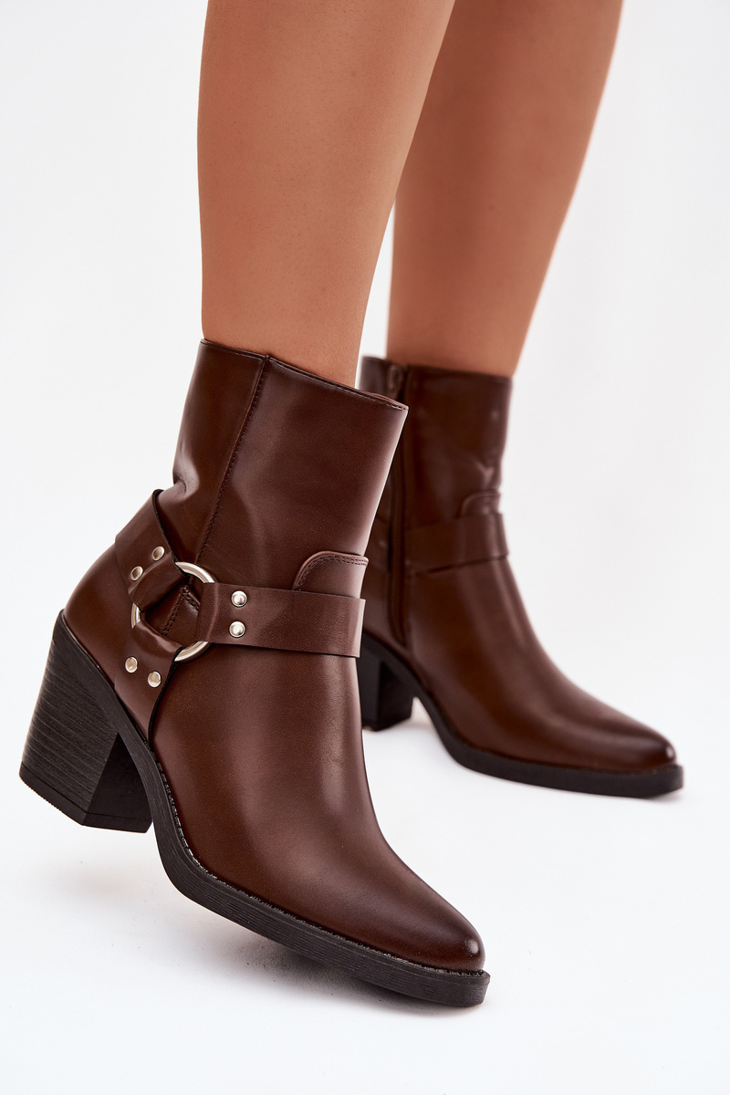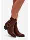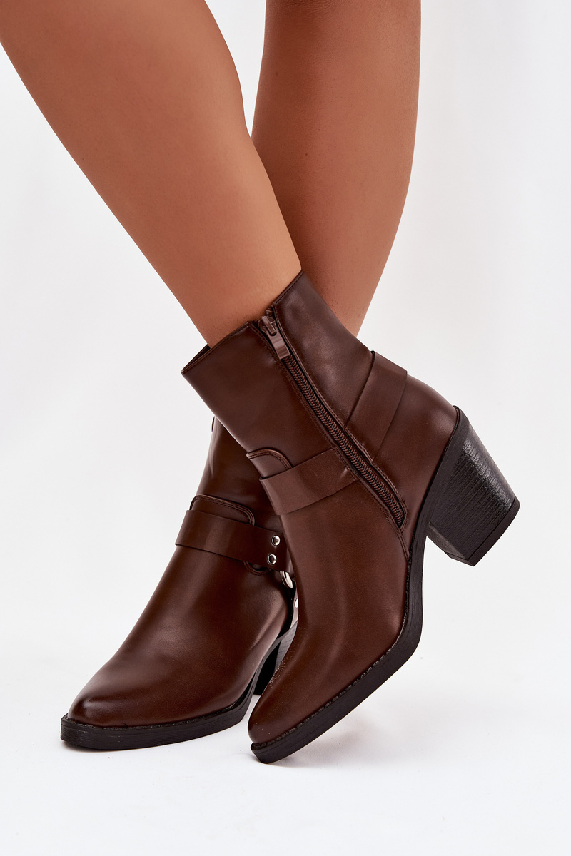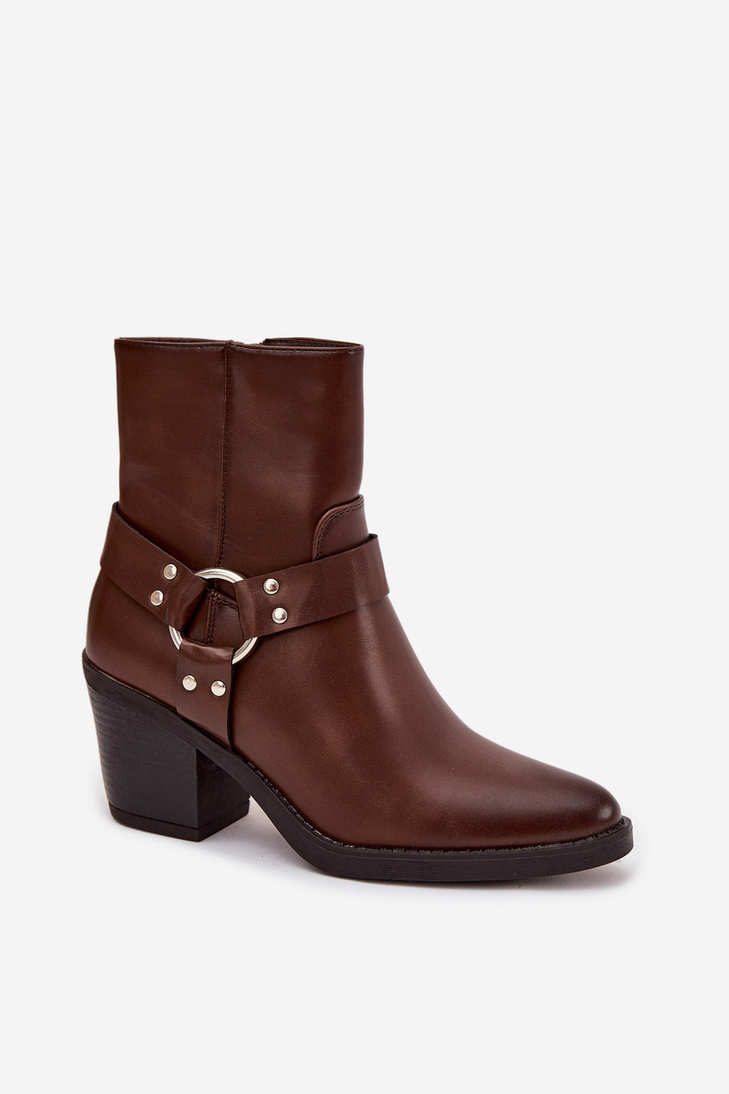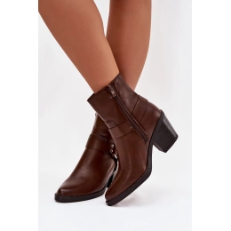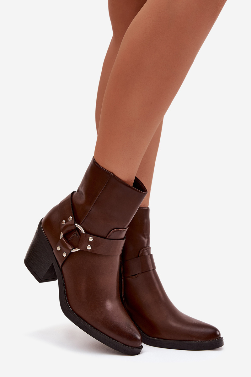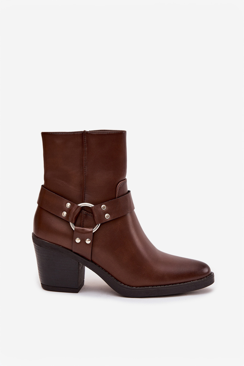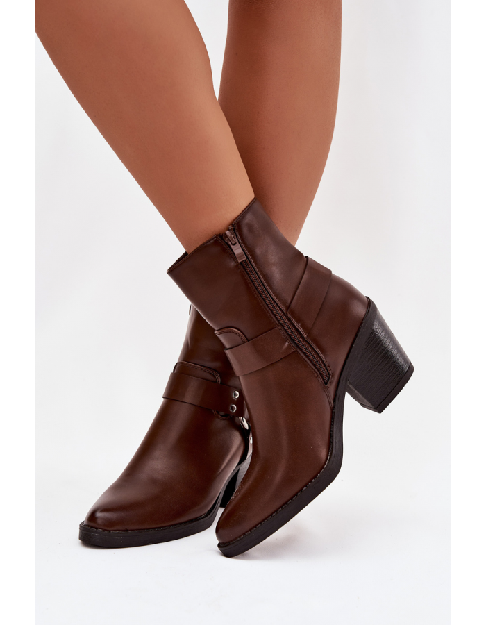 Dámské kotníkové boty ve westernovém stylu z eko kůže kombinují styl, eleganci a pohodlí. Model je postaven na stabilním, mírně zkoseném sloupkovém podpatku, který zajišťuje komfort při chůzi a jemně zeštíhluje siluetu.