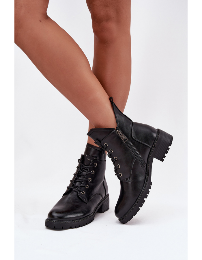 Dámské zateplené botky Vinceza v černé barvě. Mají blokový podpatek (~ 4 cm), kombinaci šněrování a bočního zipu pro lepší padnutí a pohodlí. Vnitřek je zateplený měkkým materiálem, což je ideální volba pro chladnější období.