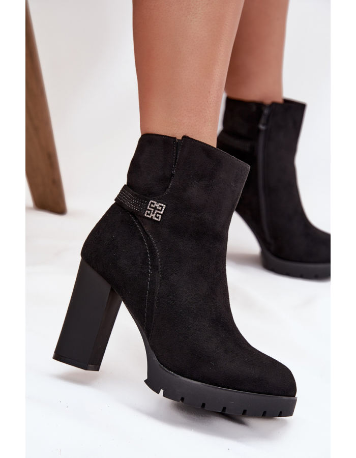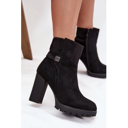 Černé zateplené kotníkové boty Zayna z eko‑semiše. Jsou osazeny stabilním sloupkovým podpatkem, mají boční zip pro pohodlné nazouvání a elegantní ozdobný pásek přes nárt. Vnitřek je zateplený pro teplo v chladných dnech.