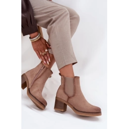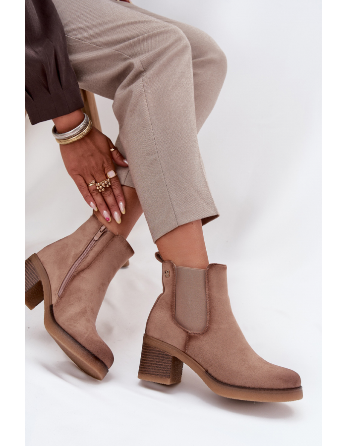 Béžové zateplené boty Zelia z ekologického semiše s bočním zipem pro snadné nazouvání. Mají stabilní sloupkový podpatek (cca 7 cm) a měkké vnitřní zateplení pro pohodlí v chladnějším počasí.