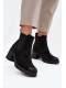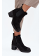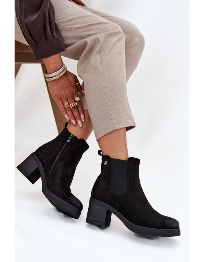 Černé zateplené boty Zelia z eko semiše. Jsou osazeny sloupkovým podpatkem (cca 7 cm), mají boční zip pro pohodlné nazouvání a vnitřní zateplení pro teplo během chladných dní. Elegantní design s jemným zlatým detailem po straně podtrhuje stylovou praktičnost.