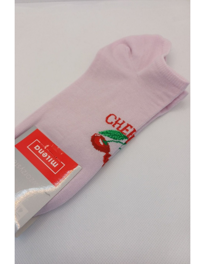 Růžové dámské kotníkové ponožky CHERRIES s motivem třešní jsou měkké, pohodlné a ideální pro každodenní nošení. Kvalitní materiál zajišťuje příjemný pocit po celý den a dobrou prodyšnost. Hravý motiv třešní dodává ponožkám veselý a originální vzhled.
