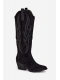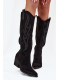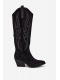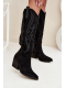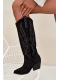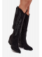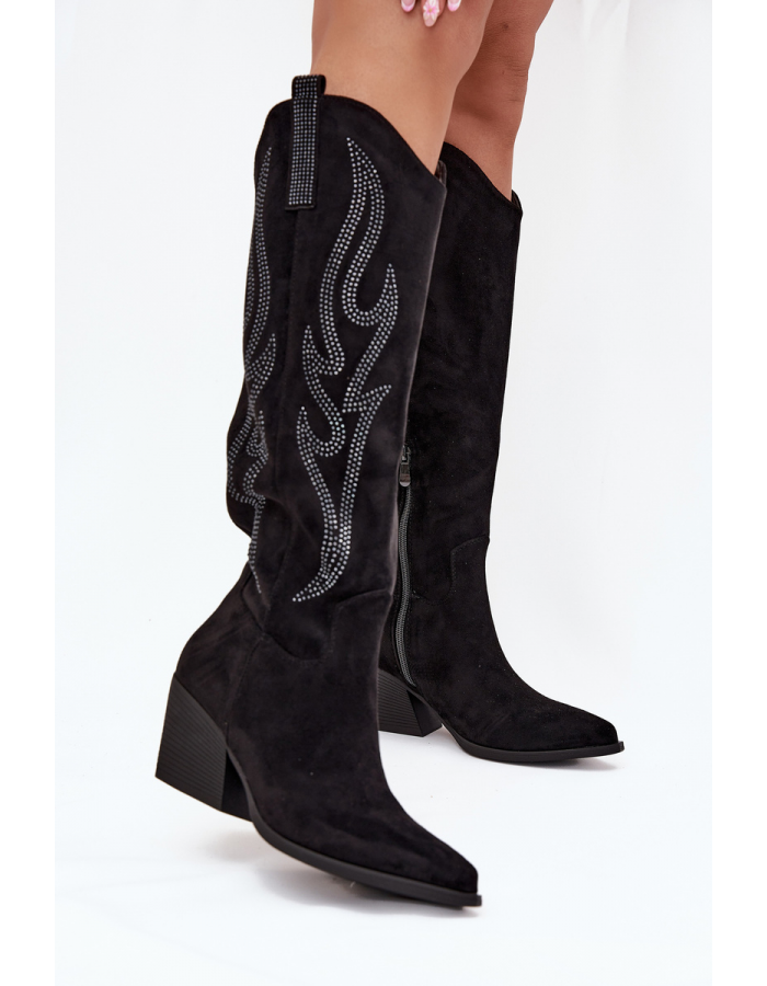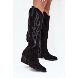 Kozačky z eko semiše na sloupkovém podpatku jsou stylovou volbou pro chladnější dny. Cholevka sahá ke kolenům a dodává botám klasický vzhled, zatímco zdobení jim propůjčuje jedinečný charakter. Špičaté špičky opticky zeštíhlují nohy. Model je wsuvací s doplňkovým zipem u spodní části boty, což zajišťuje pohodlné a snadné nazouvání. Skvělé pro elegantní i casual stylizace, ideální na zimní výlety.