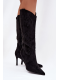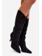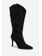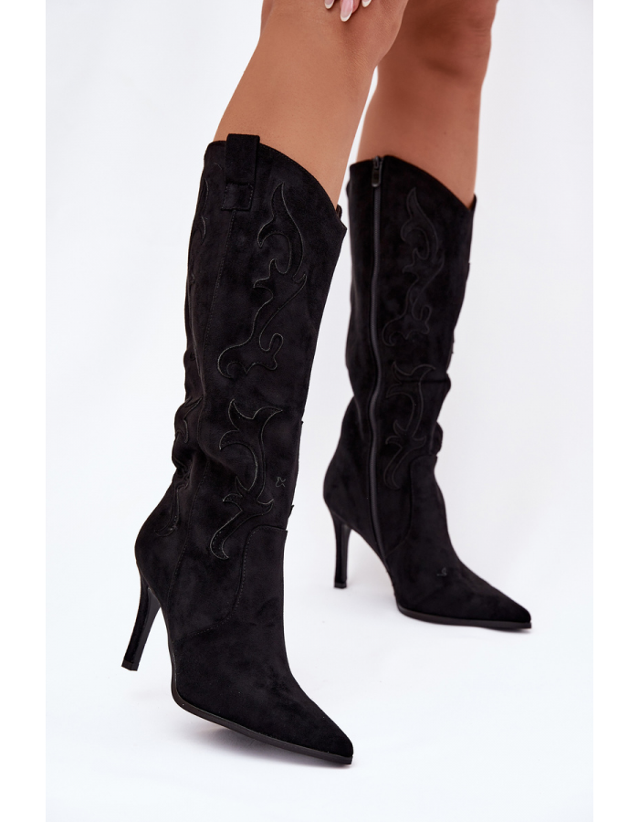 Stylové dámské kozačky Belonia v černém provedení z eko‑semiše kombinují westernový styl „kovbojek“ s elegantním podpatkem. Vysoký svršek sahá ke koleni (nebo nad něj — podle střihu), což opticky prodlužuje nohy a přidává na dramatickém efektu. Podpatek dodává botám ženský tvar a dodává outfitu výrazný stylový náboj.