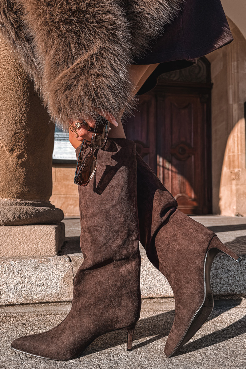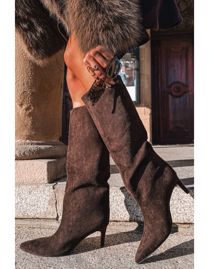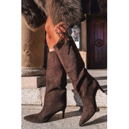 Čokoládové dámské kozačky Phelin z eko semiše s jehlovým podpatkem kombinují elegantní design a pohodlí. Elastický svršek umožňuje snadné nazouvání, zatímco stabilní podpatek zajišťuje komfortní a bezpečnou chůzi. Univerzální styl se hodí pro různé příležitosti.