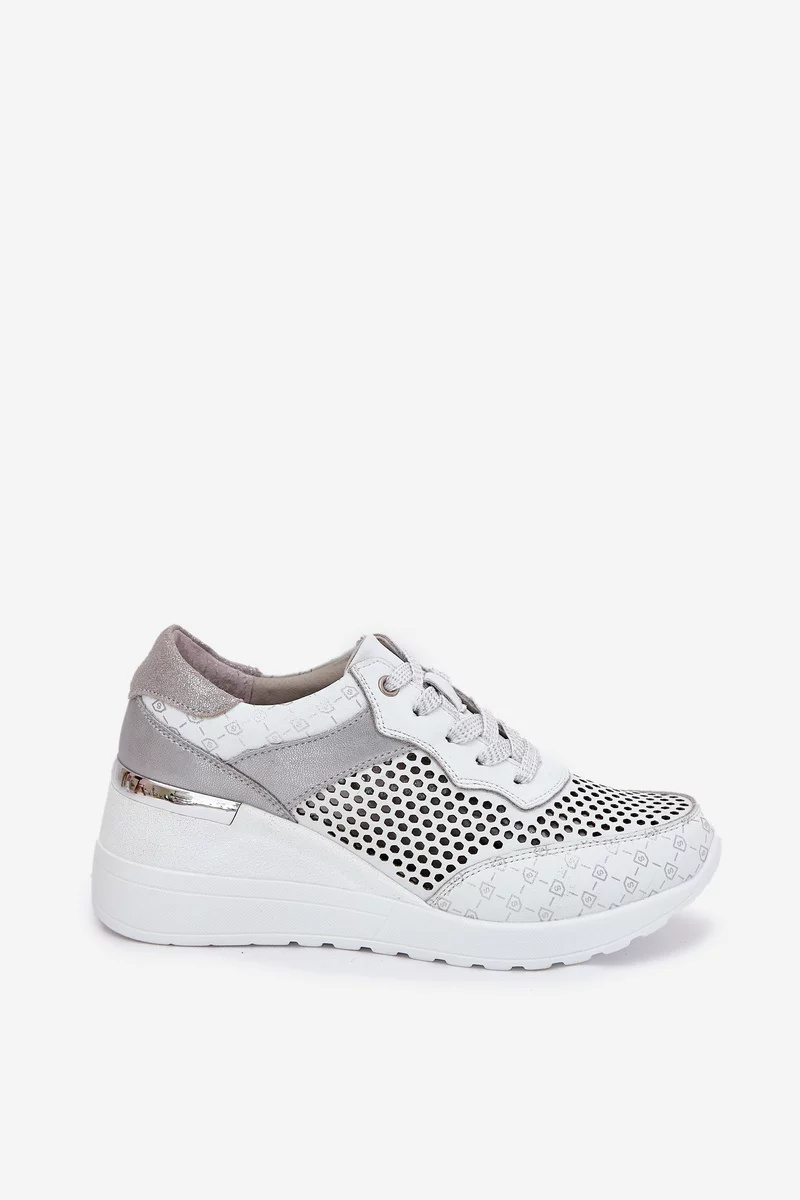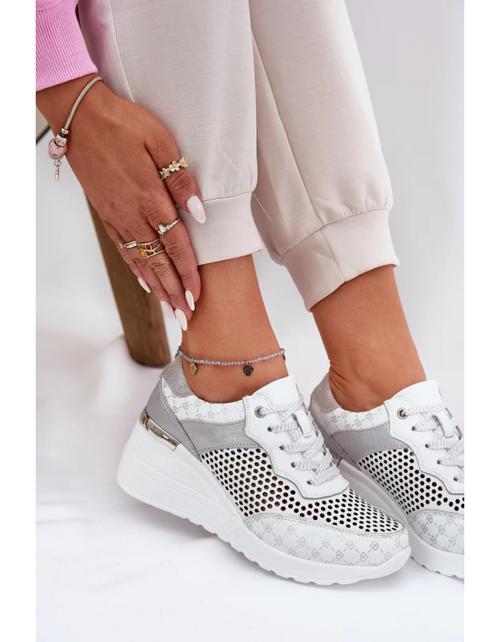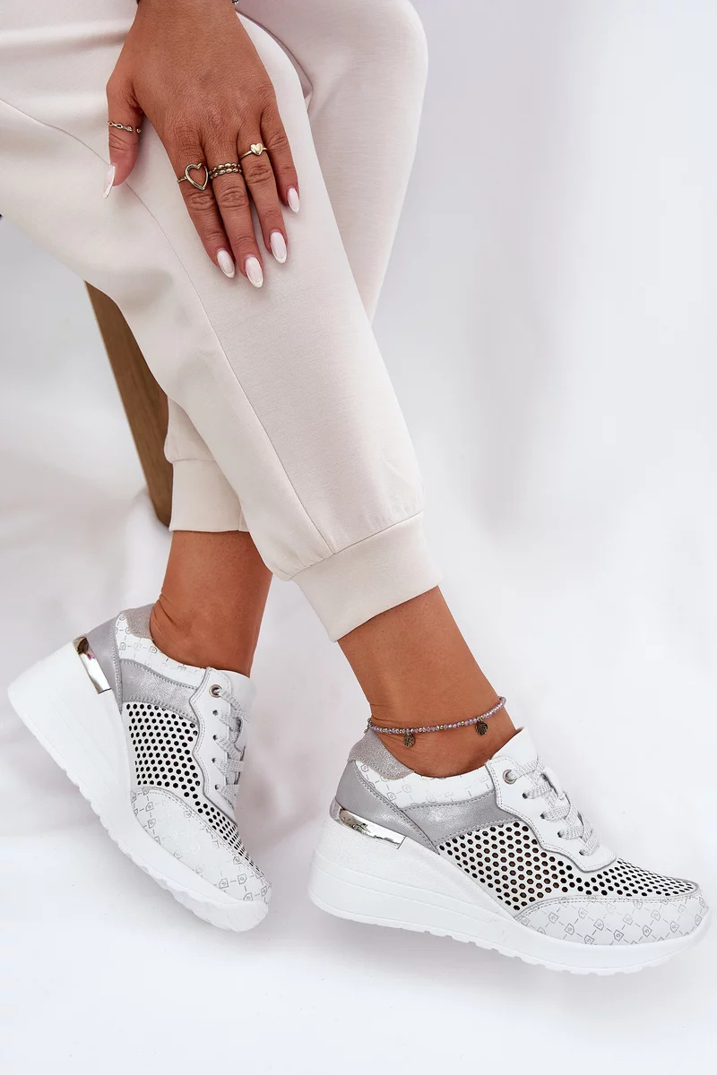 Dámské sportovní sneakersy S.Barski v bílém provedení zaujmou lehkým ažurovým designem, který zajišťuje prodyšnost a komfort při nošení. Kožený svršek působí kvalitně a elegantně, zatímco skrytý klínek (koturn) jemně zvýrazňuje siluetu a poskytuje stabilní došlap. Čistá bílá barva dodává obuvi svěží a nadčasový vzhled vhodný pro každodenní nošení.