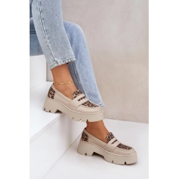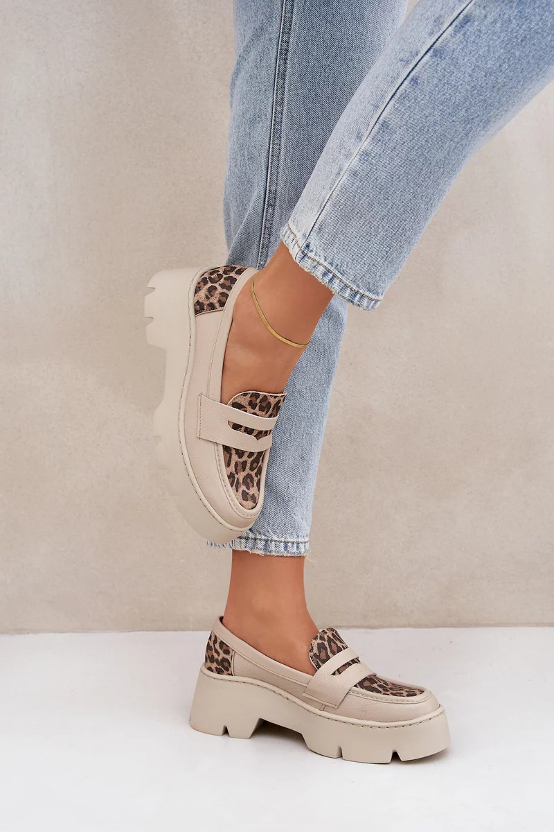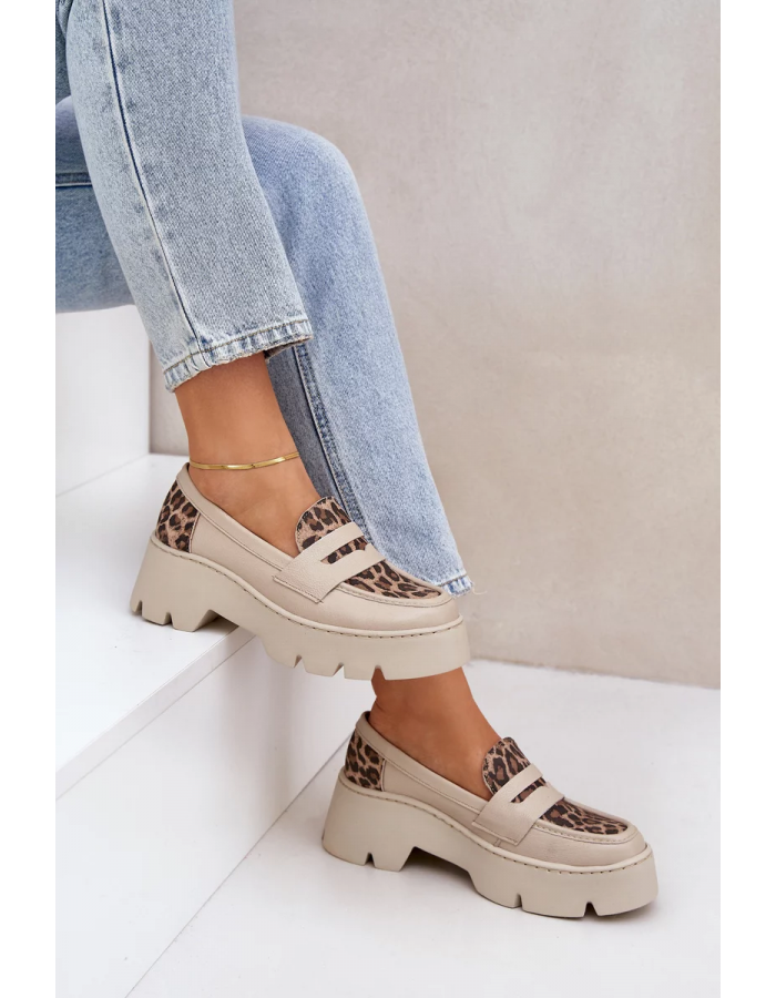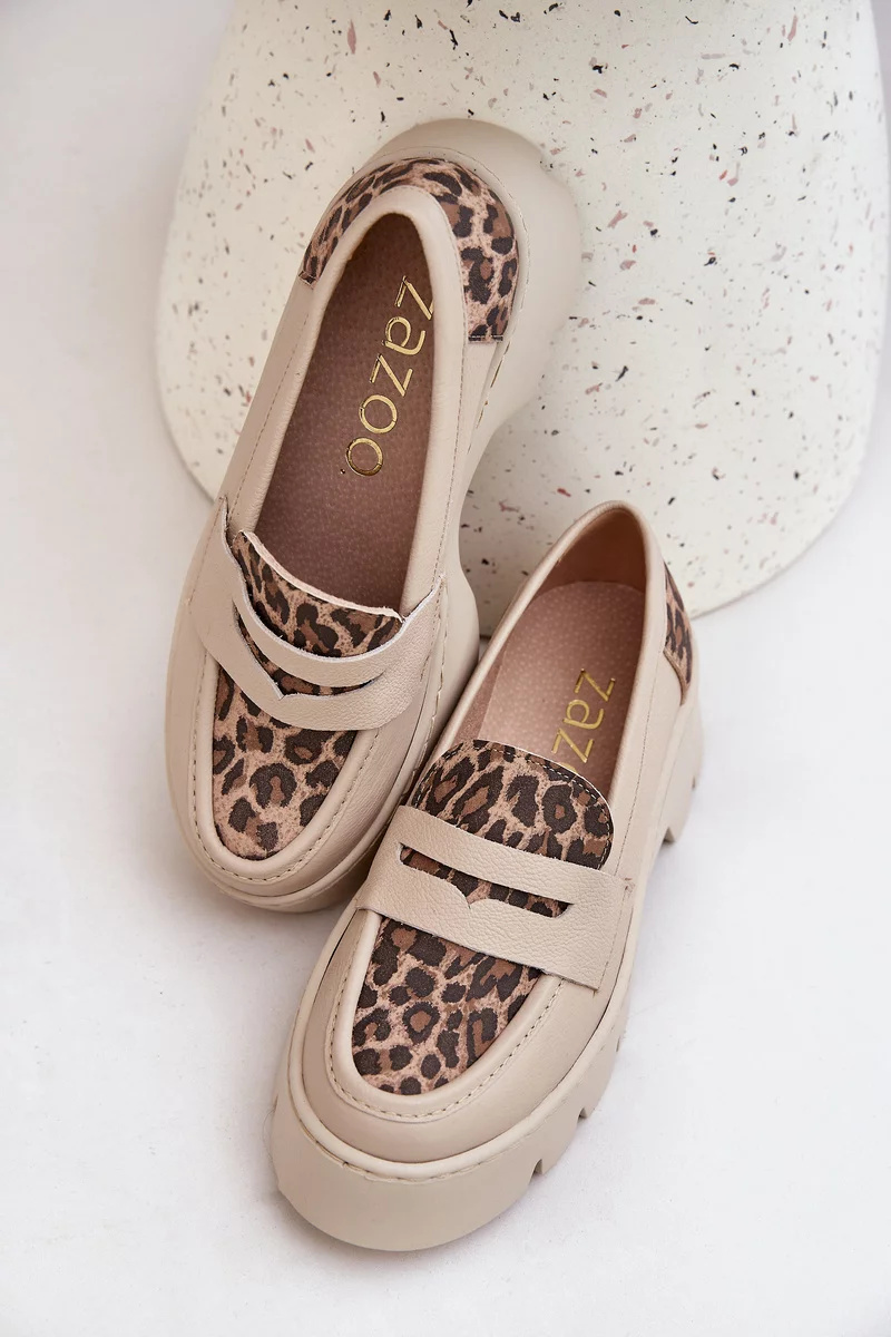 Stylové světle béžové mokasíny Zazoo z kvalitní kůže kombinují pohodlí s moderním designem. Platforma a plochý podpatek poskytují stabilitu a komfort po celý den, zatímco panterkový vzor dodává botám módní a výrazný vzhled. Ideální volba pro ženy, které chtějí spojit eleganci s originálním designem.