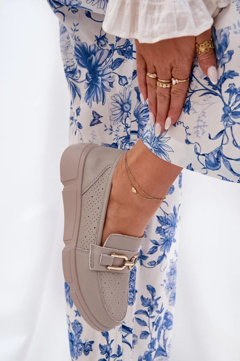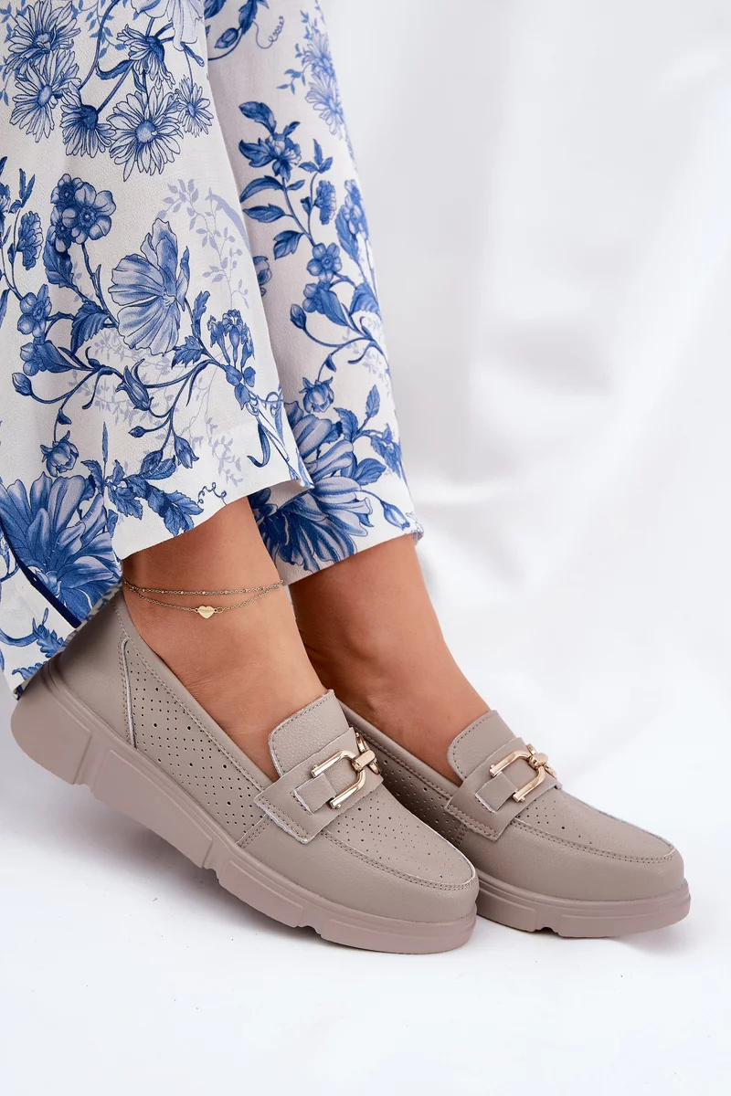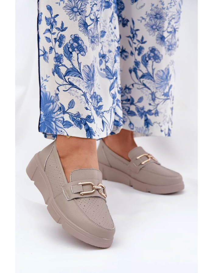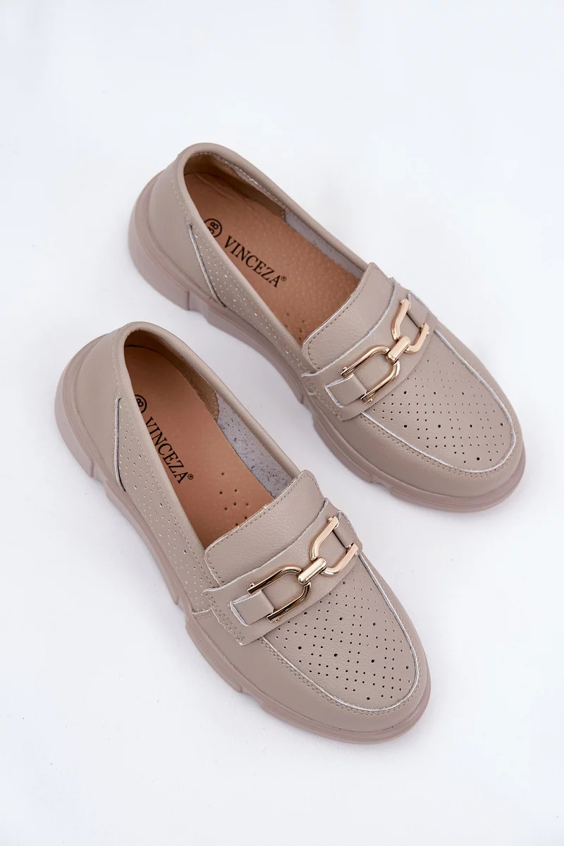 Elegantní tmavě béžové mokasíny Vinceza z kvalitní kůže spojují komfort s nadčasovým designem. Plochá podrážka a měkký materiál zajišťují pohodlí po celý den, zatímco zlatý detail dodává botám sofistikovaný a stylový vzhled vhodný k různým outfitům.