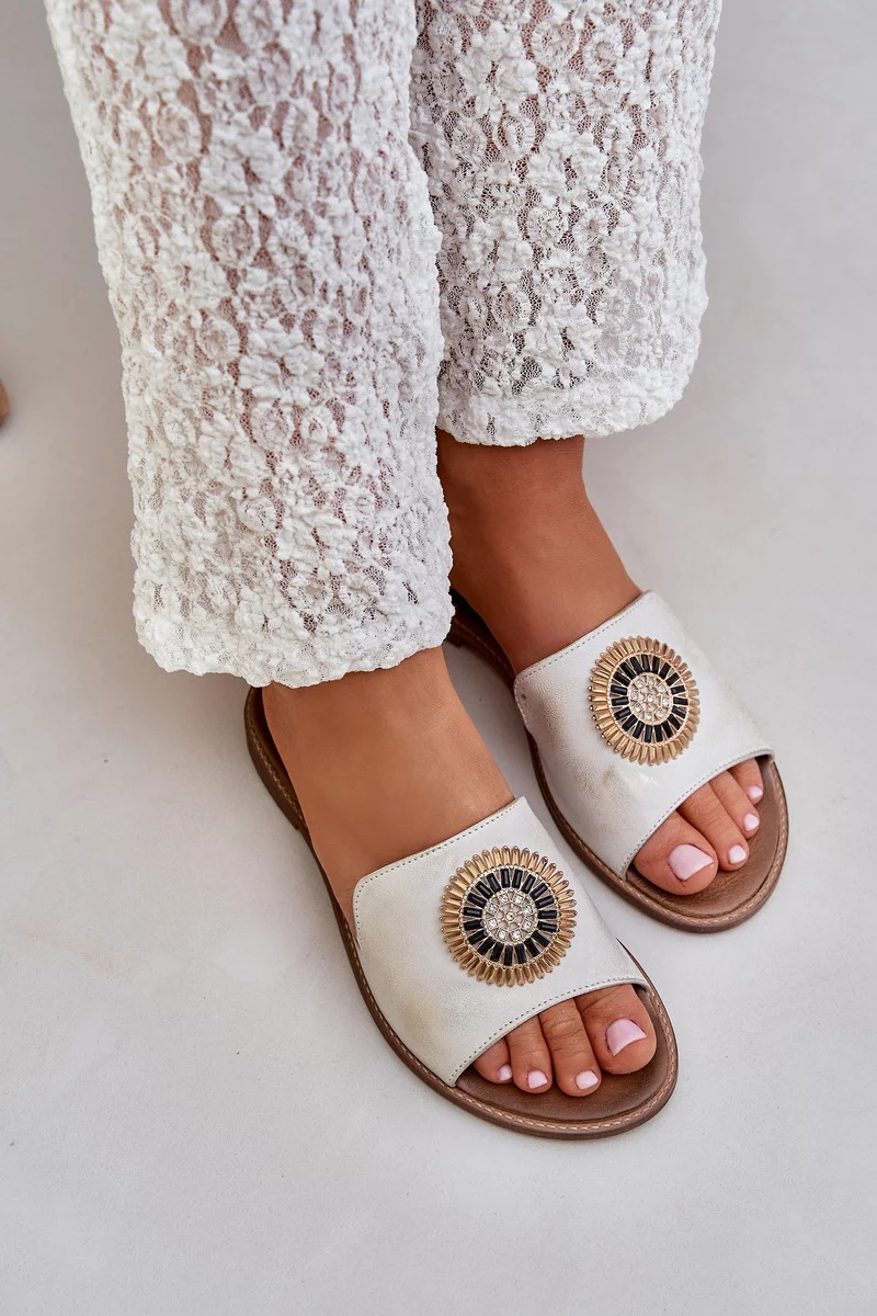 Zlaté pantofle s patinou se skvěle hodí k letním šatům, sukním i lněným kalhotám a dodají outfitu elegantní nádech.